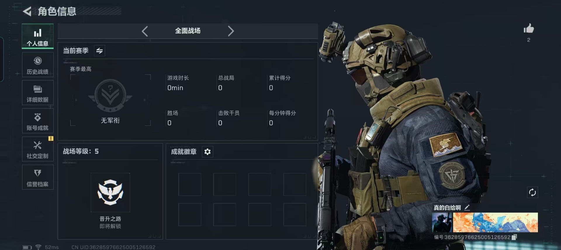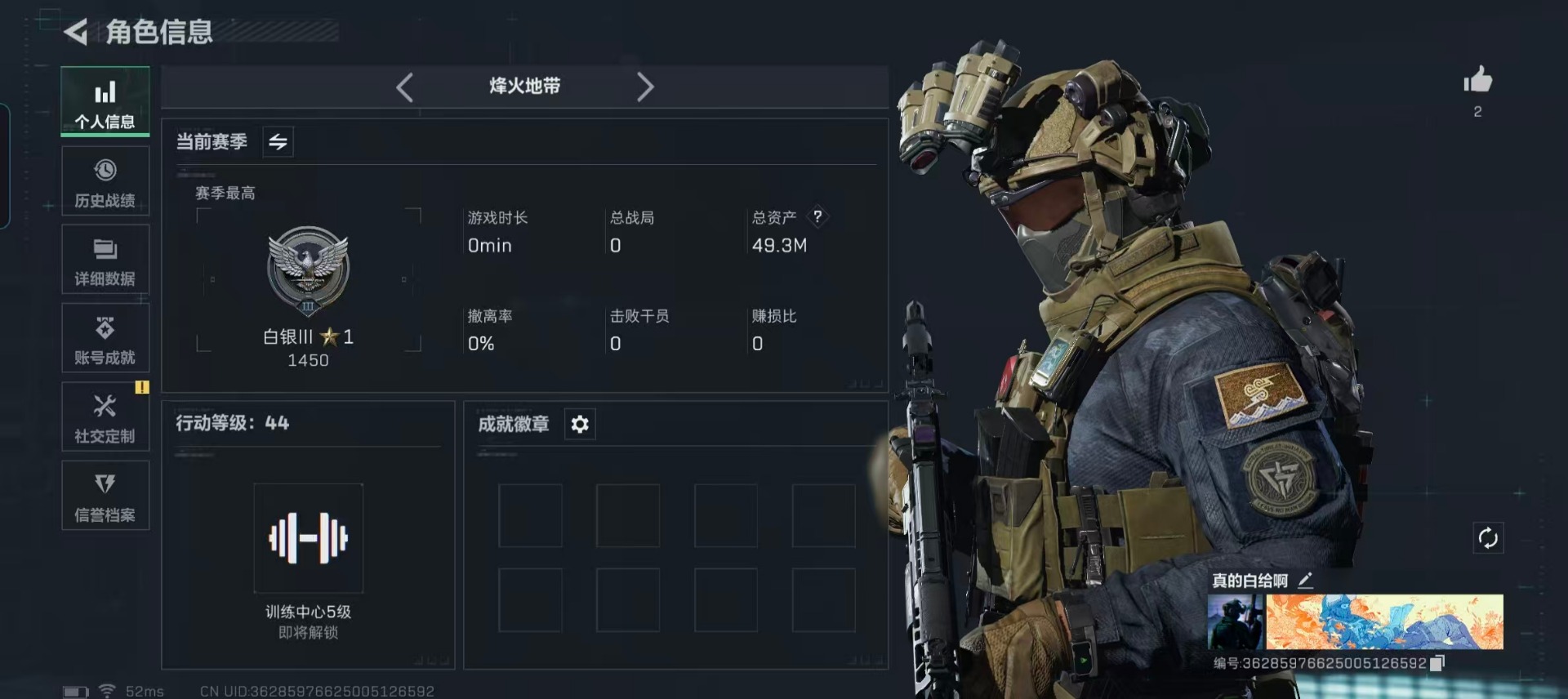 [12071878]总资产:49.3M 哈夫币:6.215K 可二次 可修改实名 烽火地带段位:白银 全面战场段位:无段位 史诗武器皮肤:M1014霰弹枪-林中猎手,AKM突击步枪-林中猎手