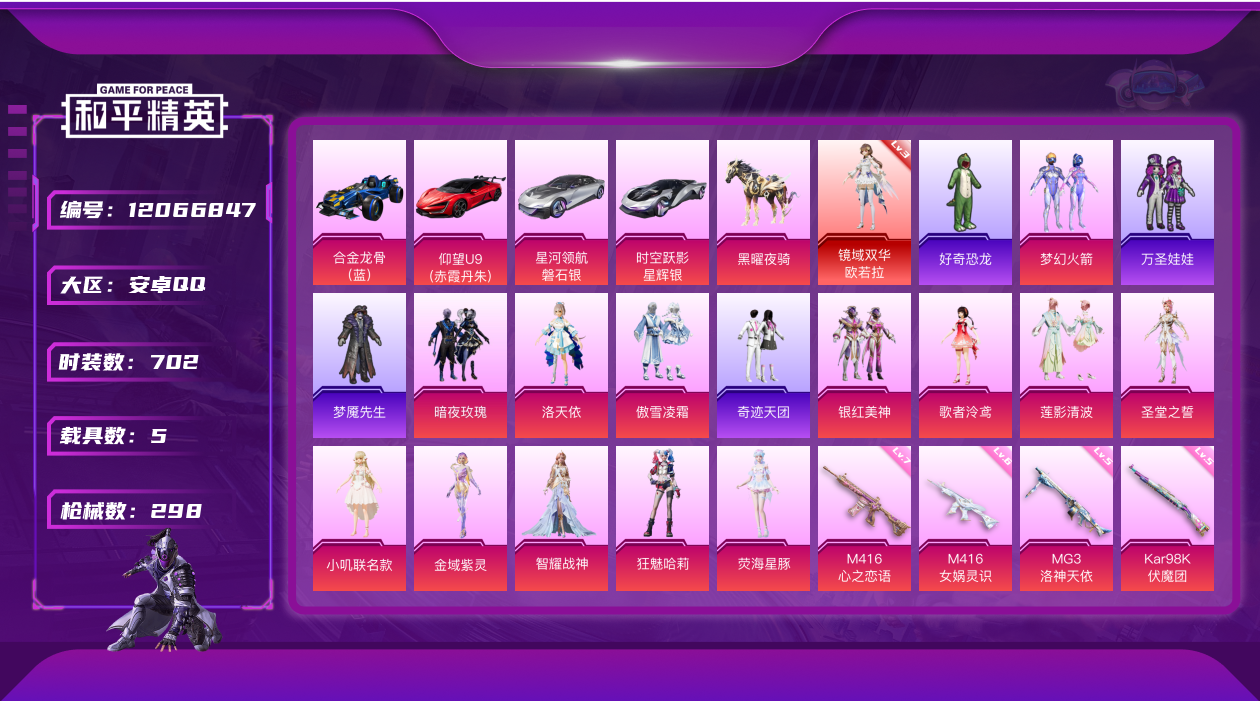 [12066847]HP0035 安卓Q 1红装13粉装13特效枪5载具 197套装298枪皮 镜域双华-欧若拉 (3级) M416-女娲灵识 (6级) SCAR-L-粉色回忆 仰望U9(赤霞丹朱) 星河领航(磐石银) 时空跃影(星辉银) 合金龙骨蓝色 黑曜夜骑 狂魅哈莉 圣堂之誓 梦幻火箭 洛天依 荧海星豚 小叽联名款 金域紫灵 智耀战神 莲影清波 歌者泠鸢 傲雪凌霜 银红美神 暗夜玫瑰 M416-心之恋语 (7级) Kar98K-巳巳如意 (5级) Kar98K-伏魔团 (5级) AWM-天使羽翼 (5级) Vector-最终圣卫者 (3级) AUG-暖羊咩咩 (5级) M24-镜域双华 (3级) GROZA-镜光银凌 (5级) AKM-梦之光华 (5级) MG3-洛神天依 (5级) 破片手榴弹-瓶中星球 (5级) 烟雾弹-甜梦果泡 (4级) 龟仙人 雪山精英 梦魇先生 万圣娃娃 好奇恐龙 奇迹天团 金羽特工 梦起落英 暗夜契约 SS1特训 团圆交子 瑞龙福将 冰爽海盐 黑色刀锋 M416-仓鼠灰灰 M762-瑞龙福将 M24-奇异狩猎者 M24-香水柠檬 AWM-激战未来 梦幻火箭飞行器 歌者泠鸢飞行器 梦幻火箭头盔 梦幻火箭背包