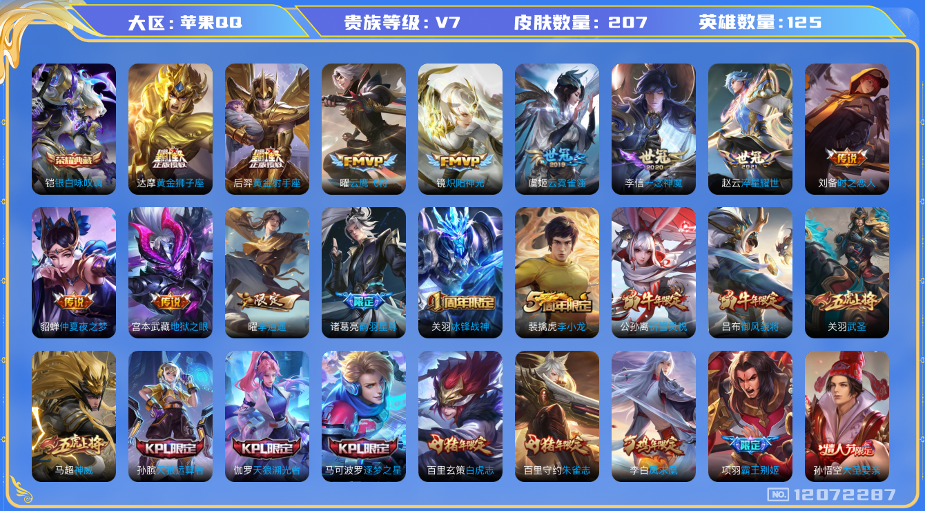 [12072287]【商品标题】:苹果Q-V4-最强王者段位-125英雄-207皮肤-1典藏-0珍品无双-0无双-0珍品传说-17传说-68史诗