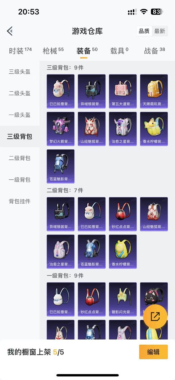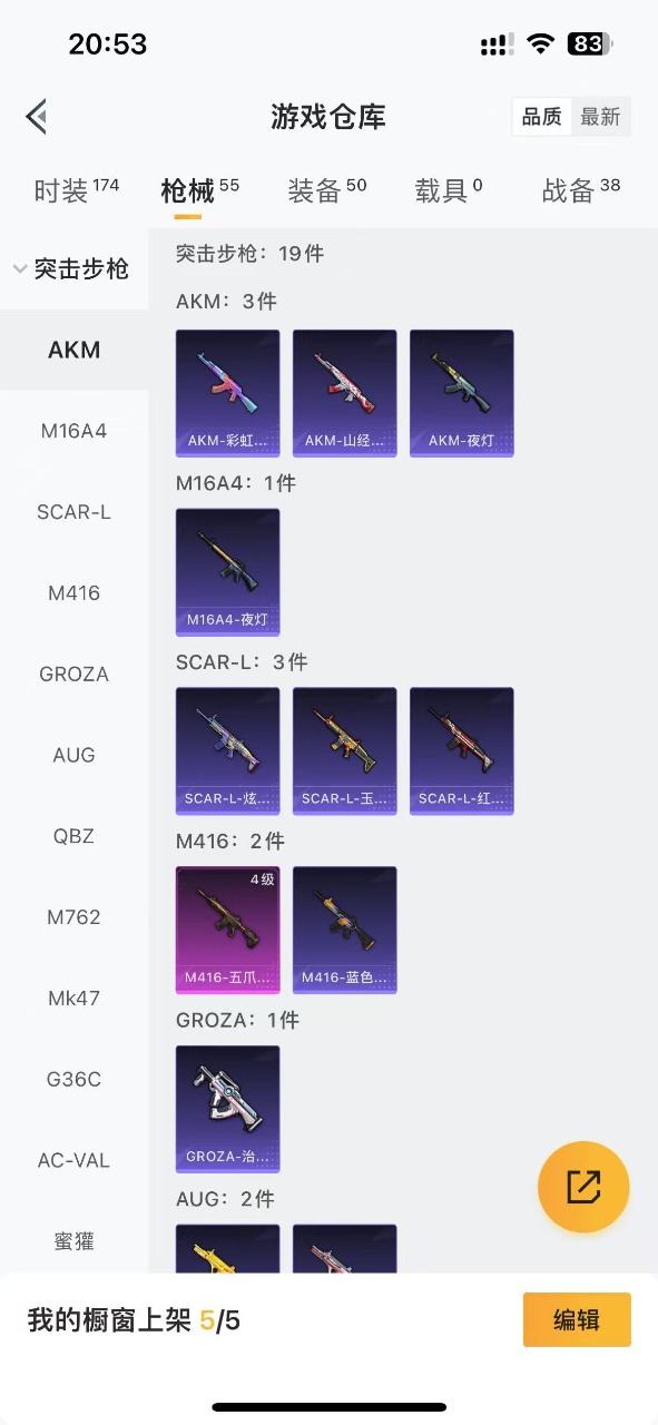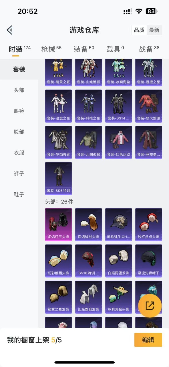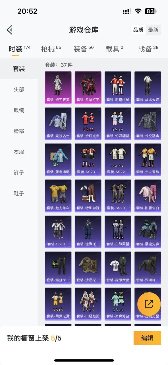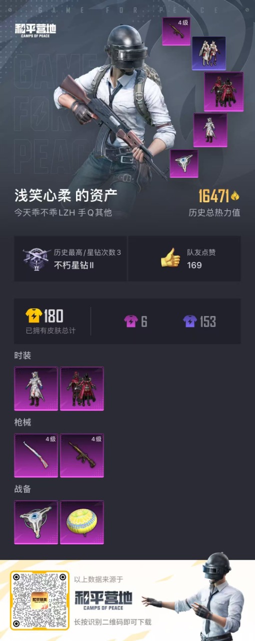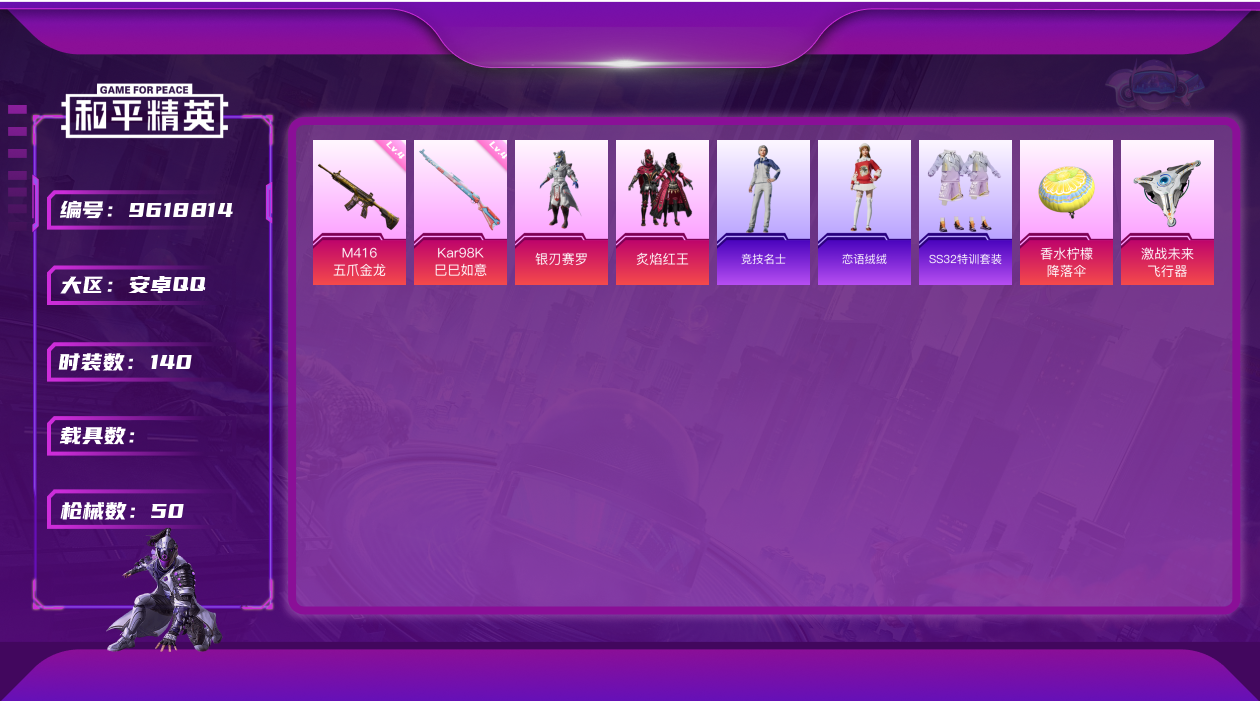 [9618814]2粉装 2特效枪 可二次 可修改实名 时装数:140 枪械数:50 战备数:0 热门装扮:炙焰红王,银刃赛罗 稀有枪皮:Kar98K-巳巳如意,M416五爪金龙 四级特效枪:四级M416-五爪金龙,四级Kar98K-巳巳如意 紫色装扮:竞技名士,恋语绒绒,SS32特训服(SS32特训套装) 优质战备:香水柠檬降落伞,飞行器-激战未来