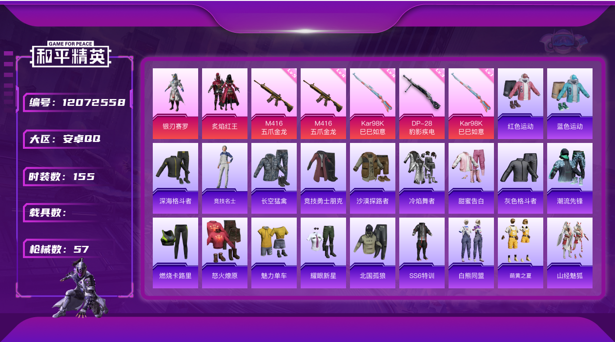 - [12264429]7粉装 3特效枪 8印记 可二次 可修改实名 身法装备:Mark.06(新蓝螳螂) 优质装备:粉色回忆,冰霜白皇,狂花道·不知火舞,AUG-许七安,七级AUG-许七安,冷漠罗丽,七级P90-冷漠罗丽,P90-冷漠罗丽,荧海星豚,Kar98K-巳巳如意 热门装扮:飒粉甜心,阿尔茜,万圣娃娃,梦魇先生 五级特效枪:五级Kar98K-巳巳如意 紫色装扮:孙悟空,幻彩翩翩,SS23特训,妙红点点,霓虹热舞,极速光影,SS31特训套装,云朵鹅,彩虹兔,雪绒豹,SS33特训套装,青涩时光,SS21特训,莱茵河畔,白兰地假日,顶瓜瓜,北国孤狼,坚韧舞者,夏日音浪,夜莺强袭者,完美偶像,帅气教官,幻世战舞者,幻影武者,萌趣咩咩,时希公主,灵公主,乐音,SS4特训,SS5特训,人气偶像,娇憨猪猪,闪银刀客,天籁歌者,SS17特训,治愈之星,迅捷之星,科技之星,SS14特训,怪笑疯兔,萌趣颜团子,SS20特训,甜心亚梦,虚音幻奏,猎梦纪元,俏皮奶喵,异彩先驱,缤纷焰火,SS18特训,雪兔飞飞,飞驰魅影,音速流光,SS19特训,军刀雅典娜,战地菁英,黄色名流,飞行日记,魅力单车,鹤鸣,黄色伏地魔,黄色运动,黑色伏地魔,龙的传人,龙腾端午,龟仙人,冰河战士,龙魂突击队,霓虹街区,跃动心情,都市漫游者,酒红色名流,酷萌兔限定,霓虹极客,野性山猫,野性战心,野性战魂,金鼠迎春,长空猛禽,雨林探路者,雪山精英,街头潮人,深蓝色名流,湖蓝色名流,滨海假日,滨海厨神,潮流炫酷,炫蓝之夏,热血青春,燃烧卡路里,牛气冲天,牛气满满,探宝勇士,极地朋克,极速红龙,橘黑制服,竞技达人朋克,红色运动,绮丽涂鸦,荧惑魅影,蓝彩潮人,蓝色运动,竞技勇士朋克,空投萌叽,疯狂小兔子,白熊同盟,白色伏地魔,破晓战魂,破蛋小黄鸡,福星高照,萝兰蝴蝶,狂花道·娜可露露,雏菊兔兔,热情海星,Mark.06(新蓝螳螂),鱼渊荷华,玉兔迎春,燕燕于飞,巳巳如意,智谋强哥,晶辉守护,石蕴玉辉,异域银装,青团波波,糖糖葫芦,竞技名士,临安公主,怀庆长公主,纯真浪花,粉红小猪,神气柴柴,懵萌河马,SS24特训(SS24特训套装),萤火魅影(套装-荧惑魅影),SS25特训,元气发射,焰鹰斗篷,幻羽潜行,蝶吟花词,情公主,小丑鱼,SS7特训,SS8特训,威严将相,玲珑飞花,SS6特训,黑夜传说,SS12特训,韶华初心,小鸟芋圆,娴静芝