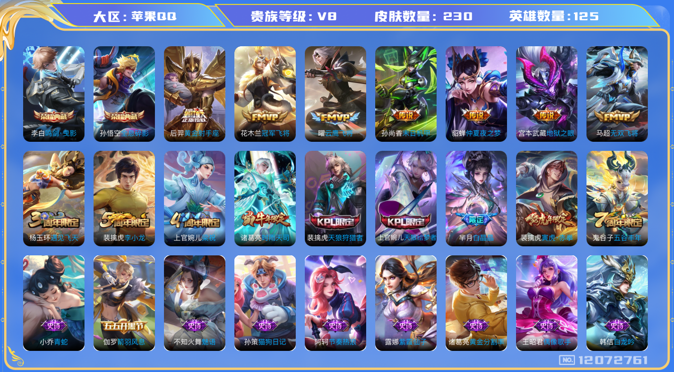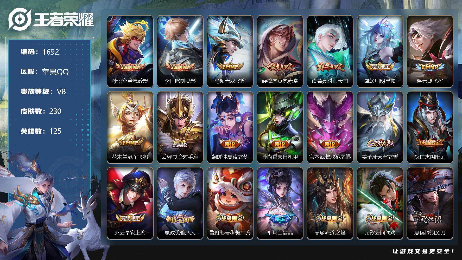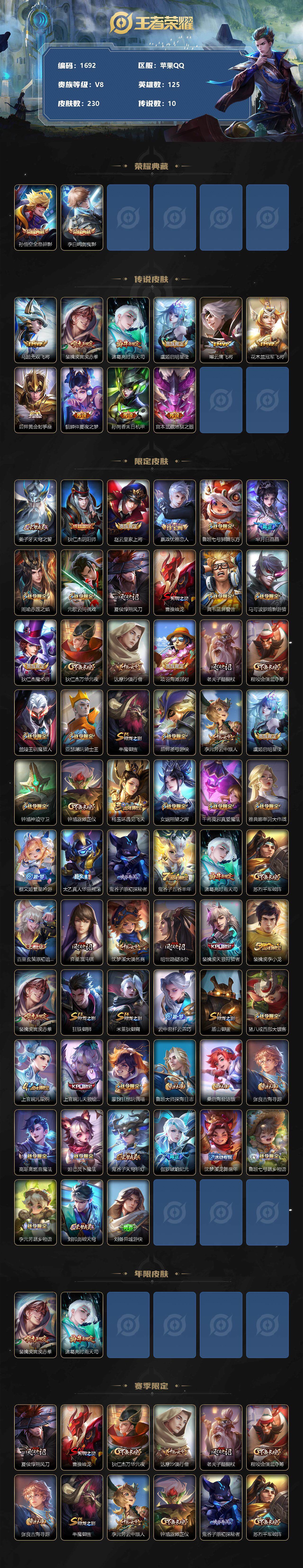 [12072761]【商品标题】:苹果Q-V3-最强王者段位-125英雄-230皮肤-2典藏-0珍品无双-0无双-0珍品传说-10传说-60史诗