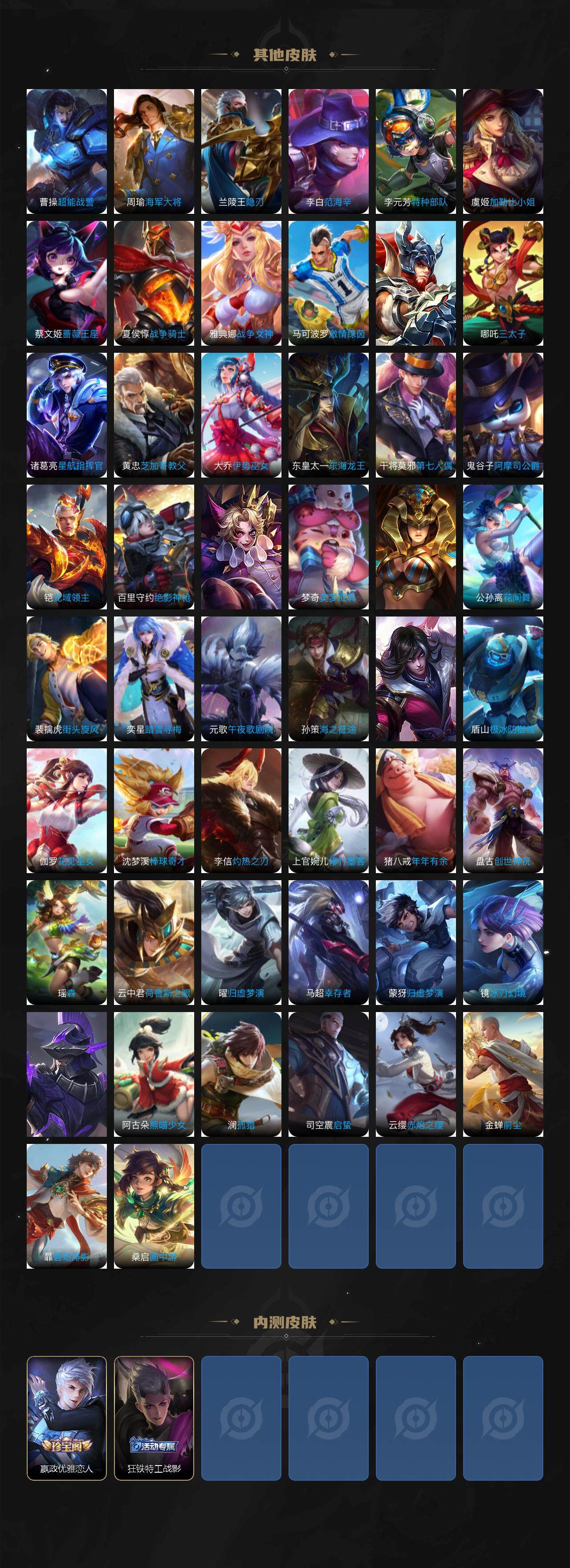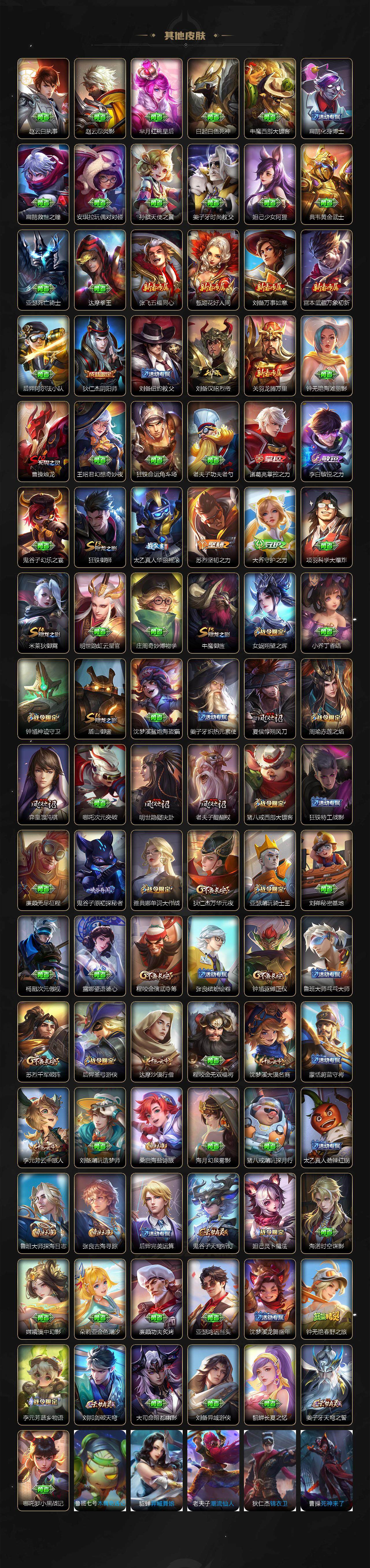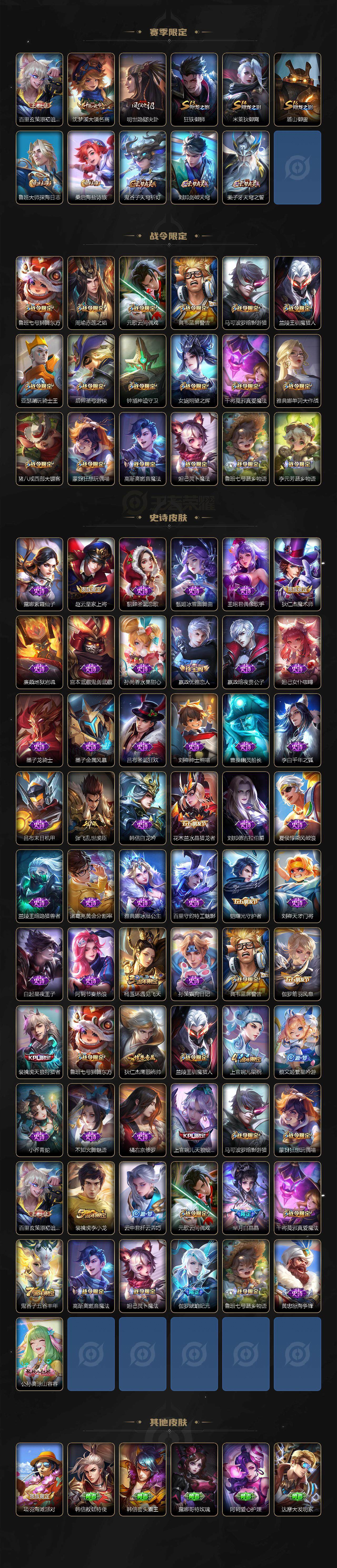 【限定皮肤】:姜子牙天穹之誓,狄仁杰阴阳师,赵云皇家上将,嬴政优雅恋人,鲁班七号狮舞东方,芈月白晶晶,周瑜赤莲之焰,元歌云间偶戏,夏侯惇朔风刀,曹操烛龙,典韦蓝屏警告,马可波罗暗影游猎,狄仁杰魔术师,狄仁杰万华元夜,达摩沙漠行僧,项羽海滩派对,老夫子醍醐杖,程咬金演武夺筹,兰陵王驯魔猎人,亚瑟潮玩骑士王,牛魔御旌,后羿圣弓游侠,李元芳云中旅人,虞姬启明星使,钟馗神迹守卫,钟馗驱傩正仪,杨玉环遇见飞天,女娲朔望之晖,干将莫邪真爱魔法,雅典娜单词大作战,蔡文姬繁星吟游,太乙真人华丽摇滚,鬼谷子原初探秘者,鬼谷子五谷丰年,诸葛亮时雨天司,苏烈千军破阵,百里玄策原初追逐者,弈星混沌棋,沈梦溪大漠名商,明世隐疑决卦,裴擒虎天狼狩猎者,裴擒虎李小龙,裴擒虎寅虎赤拳,狂铁御狮,米莱狄御霄,云中君纤云弄巧,盾山御銮,猪八戒西部大镖客,上官婉儿梁祝,上官婉儿天狼绘梦者,蒙犽狂想玩偶喵,鲁班大师探海日志,桑启海盐诗旅,张良古海寻踪,高渐离燃音魔法,妲己灵卜魔法,鬼谷子天穹祈灯,伽罗琥珀纪元,沈梦溪龙舞盛年,鲁班七号蔬乡物语,李元芳蔬乡物语,刘邦剑破天穹,刘备异域游侠