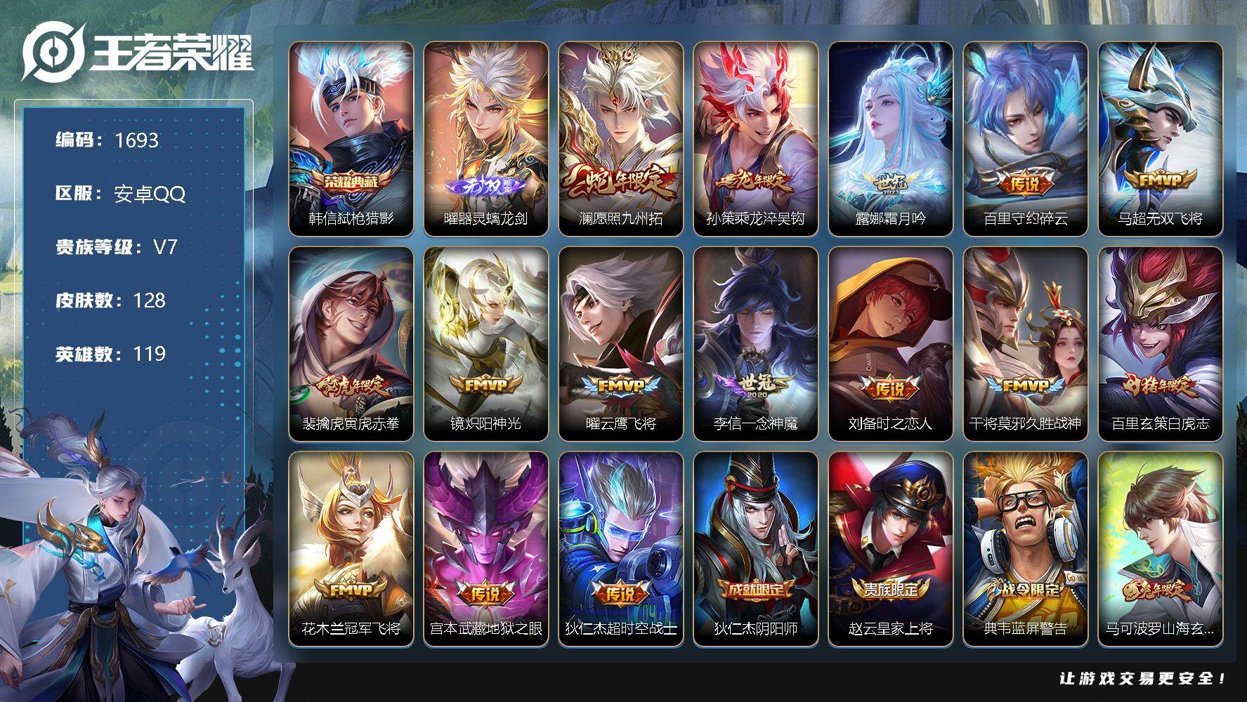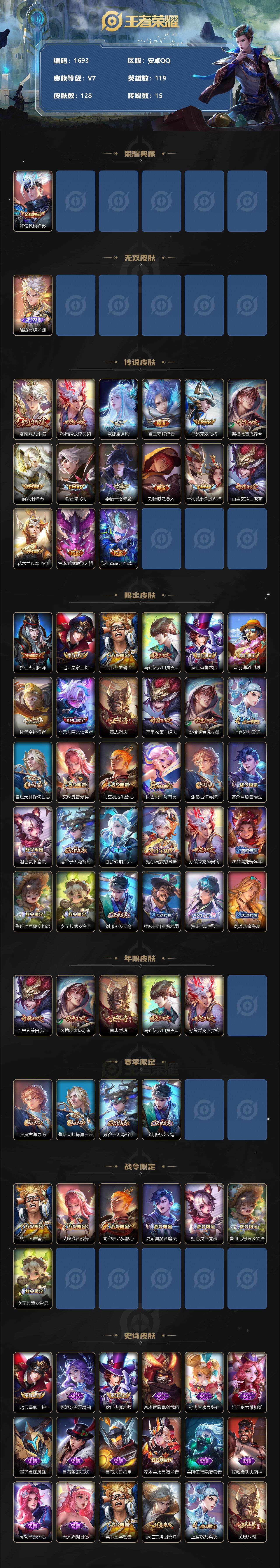 [12072800]【商品标题】:安卓Q-V7-永恒钻石V段位-119英雄-128皮肤-1典藏-0珍品无双-1无双-0珍品传说-15传说-30史诗