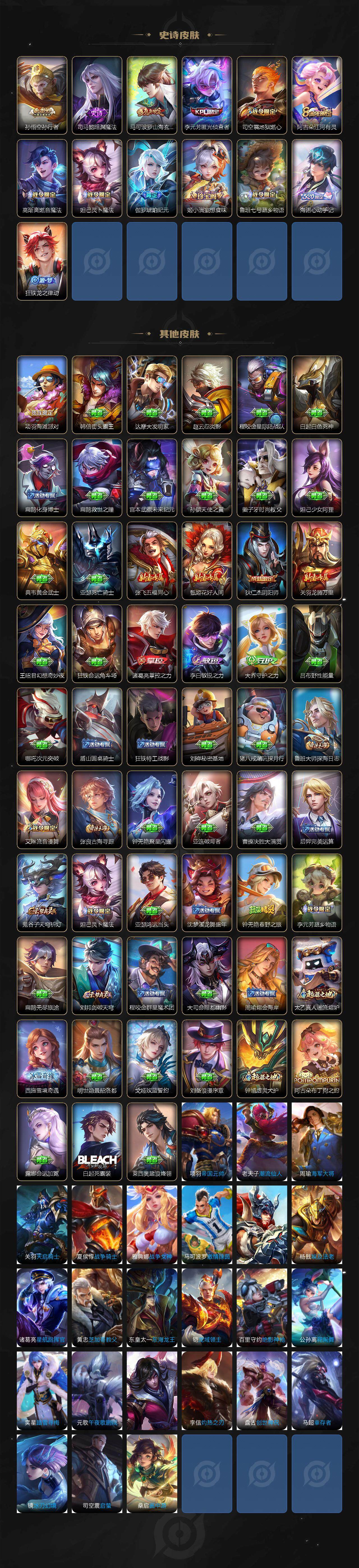 【史诗皮肤】:赵云皇家上将,甄姬冰雪圆舞曲,狄仁杰魔术师,宫本武藏鬼剑武藏,孙尚香水果甜心,妲己魅力维加斯,墨子金属风暴,吕布圣诞狂欢,吕布末日机甲,花木兰水晶猎龙者,兰陵王暗隐猎兽者,程咬金功夫厨神,阿轲节奏热浪,大乔猫狗日记,典韦蓝屏警告,狄仁杰鹰眼统帅,上官婉儿梁祝,黄忠烈魂,孙悟空孙行者,司马懿暗渊魔法,马可波罗山海玄木吟,李元芳匿光侦查者,司空震地狱燃心,阿古朵江河有灵,妲己灵卜魔法,高渐离燃音魔法,伽罗琥珀纪元,姬小满妄想食味,鲁班七号蔬乡物语,海诺心动手记,狂铁龙之律动