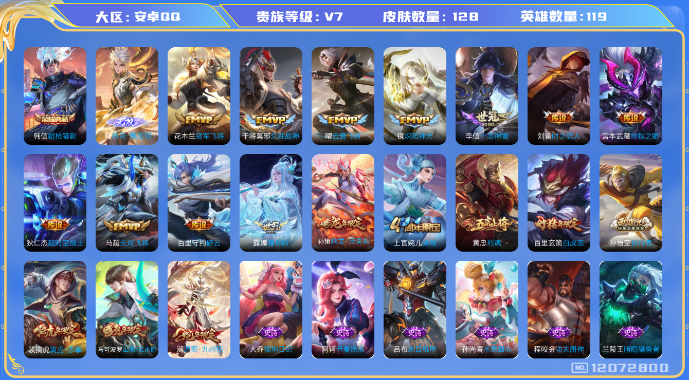 - [11497662]V7 1典藏 6传说 123英雄 186皮肤 可修改实名 荣耀水晶:全息碎影(猴子典藏) 传说皮:幻光神枪,零号·赤焰,地狱之眼 珍宝阁皮:优雅恋人,女武神 限定皮:愿照·千秋盛(女娲年限),鸣野蒿,凤求凰(白切鸡),遇见飞天,五谷丰年,梁祝,李小龙,默契交锋-花木兰 史诗皮:星界战将,器灵·浮梦炉,上官婉儿群星魔术团,紫霞仙子,黄金分割率,特工魅影,千年之狐,江河有灵,蒙恬荣光圣徽,偶像歌手,无限星赏官,电玩·爆裂旋风,龙骑士(小龙虾),猫狗日记-孙策,乱世虎臣,节奏热浪,女仆咖啡,水果甜心,天才门将,星夜王子,功夫厨神,德古拉伯爵,暗隐猎兽者,幽灵船长,鬼剑武藏,舞动绿茵,地狱岩魂,纤云弄巧,缤纷独角兽,乘风破浪,逐浪之夏,水晶猎龙者,曙光守护者,箭羽风息,金属风暴,原初追逐者,圣诞狂欢,圣诞恋歌,鹰眼统帅,魅力维加斯