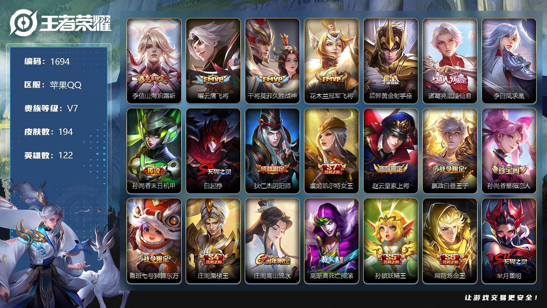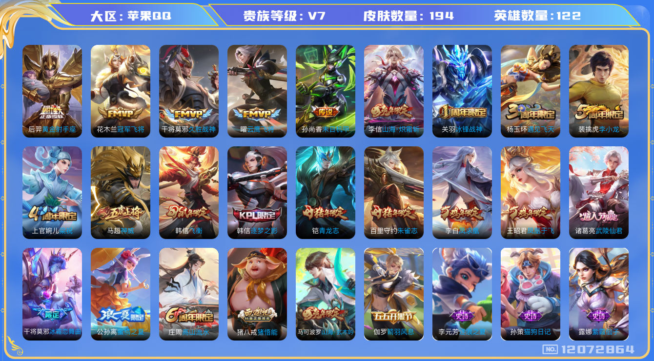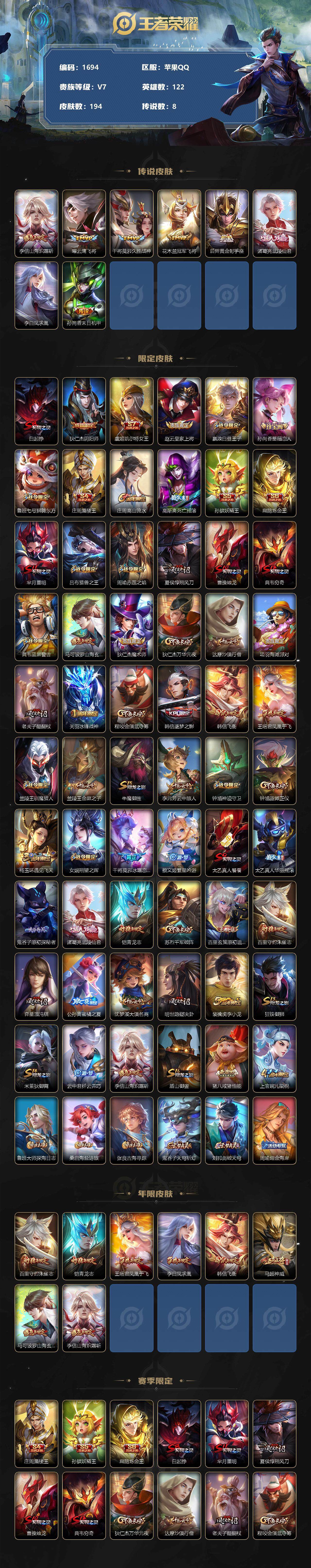 [12072864]【商品标题】:苹果Q-V0-至尊星耀IV段位-122英雄-194皮肤-0典藏-0珍品无双-0无双-0珍品传说-8传说-46史诗