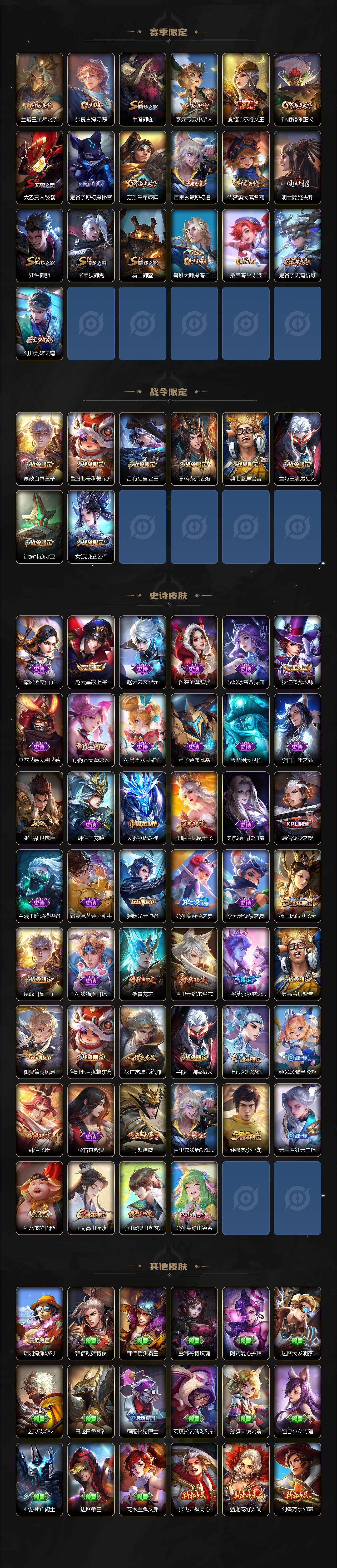 【赛季限定】:庄周蜃楼王,孙膑妖精王,扁鹊炼金王,白起狰,芈月重明,夏侯惇朔风刀,曹操烛龙,典韦穷奇,狄仁杰万华元夜,达摩沙漠行僧,老夫子醍醐杖,程咬金演武夺筹,兰陵王金庭之子,张良古海寻踪,牛魔御旌,李元芳云中旅人,虞姬凯尔特女王,钟馗驱傩正仪,太乙真人饕餮,鬼谷子原初探秘者,苏烈千军破阵,百里玄策原初追逐者,弈星混沌棋,沈梦溪大漠名商,明世隐疑决卦,狂铁御狮,米莱狄御霄,盾山御銮,鲁班大师探海日志,桑启海盐诗旅,鬼谷子天穹祈灯,刘邦剑破天穹
