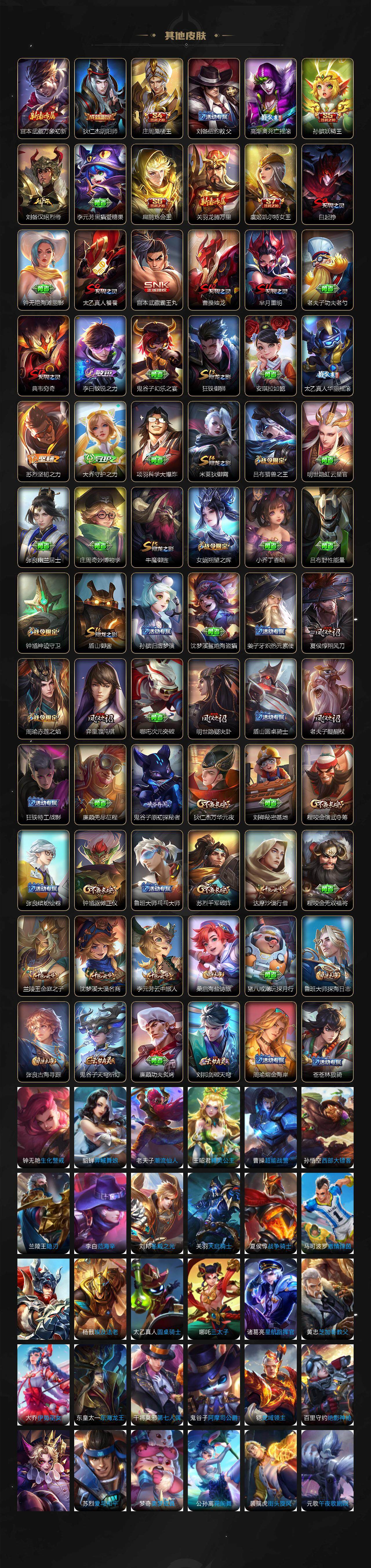 【限定皮肤】:白起狰,狄仁杰阴阳师,虞姬凯尔特女王,赵云皇家上将,嬴政白昼王子,孙尚香蔷薇恋人,鲁班七号狮舞东方,庄周蜃楼王,庄周高山流水,高渐离死亡摇滚,孙膑妖精王,扁鹊炼金王,芈月重明,吕布猎兽之王,周瑜赤莲之焰,夏侯惇朔风刀,曹操烛龙,典韦穷奇,典韦蓝屏警告,马可波罗山海玄木吟,狄仁杰魔术师,狄仁杰万华元夜,达摩沙漠行僧,项羽海滩派对,老夫子醍醐杖,关羽冰锋战神,程咬金演武夺筹,韩信逐梦之影,韩信飞衡,王昭君凤凰于飞,兰陵王驯魔猎人,兰陵王金庭之子,牛魔御旌,李元芳云中旅人,钟馗神迹守卫,钟馗驱傩正仪,杨玉环遇见飞天,女娲朔望之晖,干将莫邪冰霜恋舞曲,蔡文姬繁星吟游,太乙真人饕餮,太乙真人华丽摇滚,鬼谷子原初探秘者,诸葛亮武陵仙君,铠青龙志,苏烈千军破阵,百里玄策原初追逐者,百里守约朱雀志,弈星混沌棋,公孙离蜜橘之夏,沈梦溪大漠名商,明世隐疑决卦,裴擒虎李小龙,狂铁御狮,米莱狄御霄,云中君纤云弄巧,李信山海炽霜斩,盾山御銮,猪八戒猪悟能,上官婉儿梁祝,鲁班大师探海日志,桑启海盐诗旅,张良古海寻踪,鬼谷子天穹祈灯,刘邦剑破天穹,周瑜熔金海岸