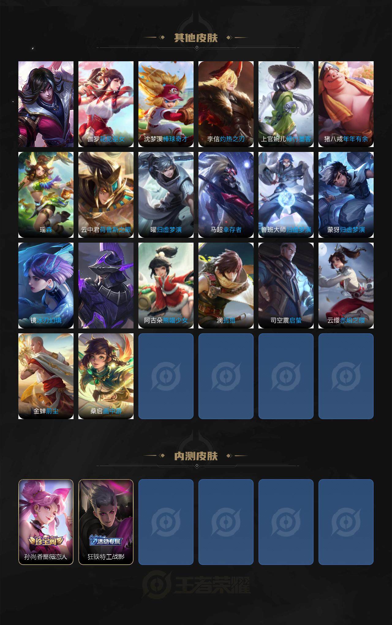 庄周蜃楼王,孙膑妖精王,扁鹊炼金王,虞姬凯尔特女王,白起狰,太乙真人饕餮,曹操烛龙,芈月重明,典韦穷奇,狂铁御狮,米莱狄御霄,牛魔御旌,盾山御銮,夏侯惇朔风刀,明世隐疑决卦,老夫子醍醐杖,鬼谷子原初探秘者,狄仁杰万华元夜,程咬金演武夺筹,钟馗驱傩正仪,苏烈千军破阵,吕布猎兽之王,嬴政白昼王子,女娲朔望之晖,典韦蓝屏警告,钟馗神迹守卫,鲁班七号狮舞东方,弈星混沌棋,达摩沙漠行僧,兰陵王金庭之子,沈梦溪大漠名商,李元芳云中旅人,桑启海盐诗旅,鲁班大师探海日志,张良古海寻踪