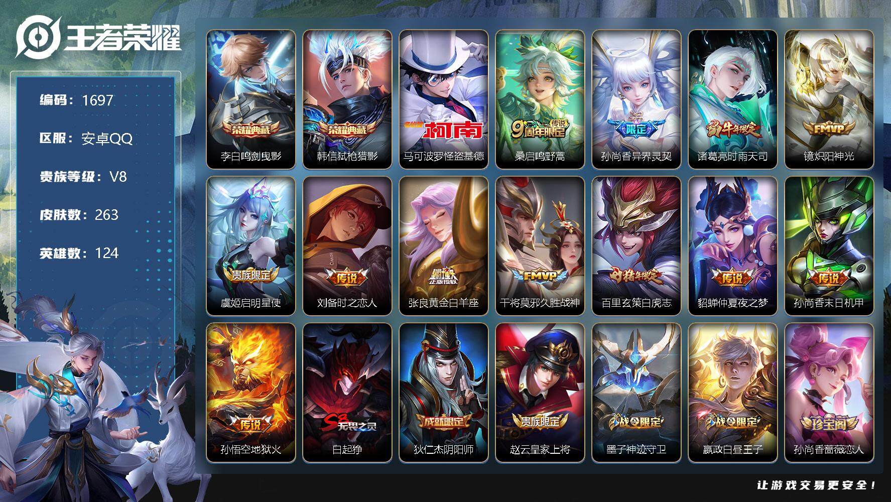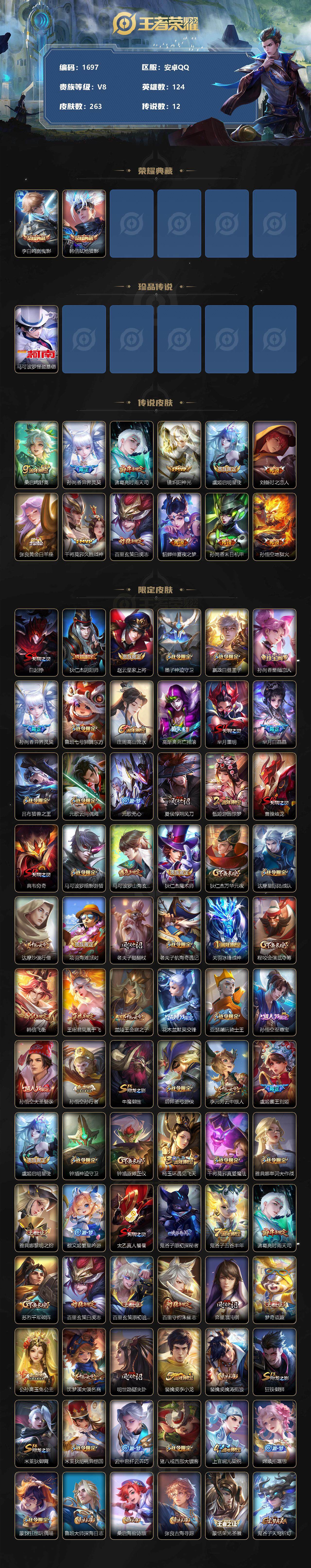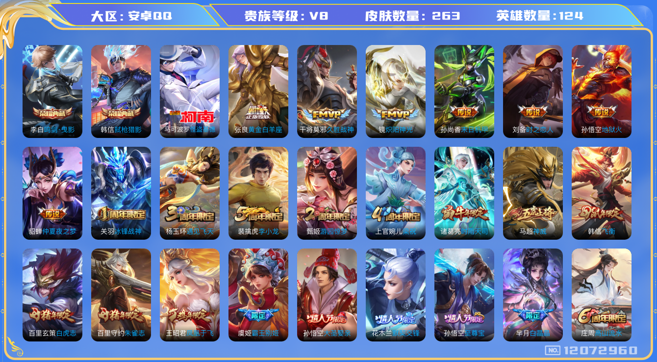 [12072960]【商品标题】:安卓Q-V0-最强王者段位-124英雄-263皮肤-2典藏-0珍品无双-0无双-1珍品传说-12传说-78史诗