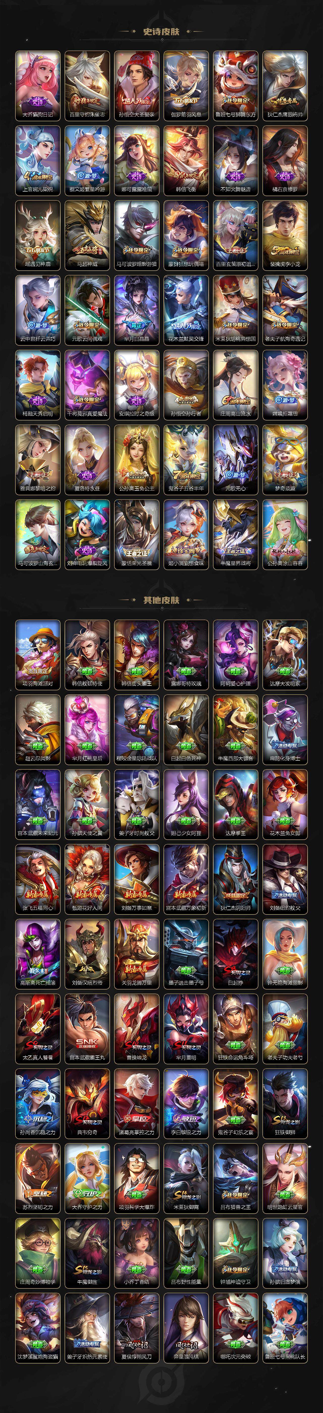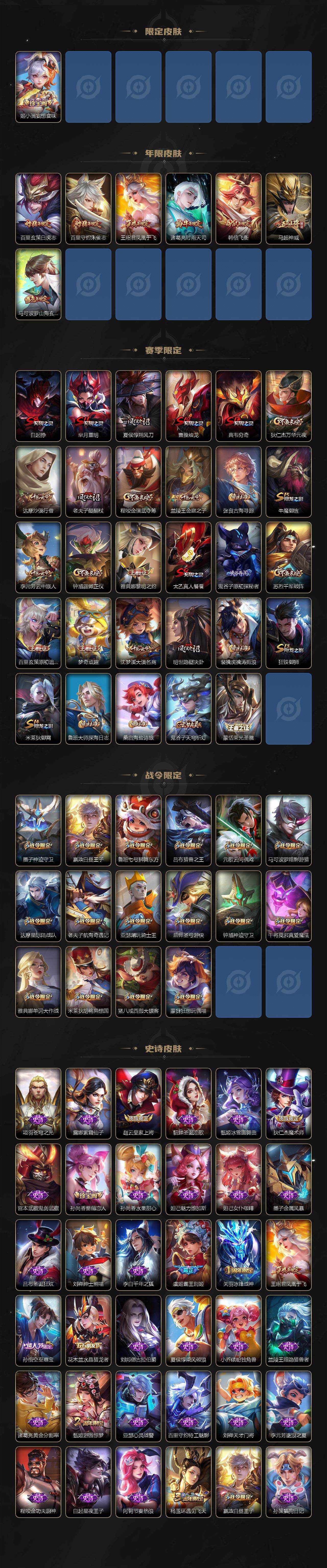 【限定皮肤】:白起狰,狄仁杰阴阳师,赵云皇家上将,墨子神迹守卫,嬴政白昼王子,孙尚香蔷薇恋人,孙尚香异界灵契,鲁班七号狮舞东方,庄周高山流水,高渐离死亡摇滚,芈月重明,芈月白晶晶,吕布猎兽之王,元歌云间偶戏,元歌无心,夏侯惇朔风刀,甄姬游园惊梦,曹操烛龙,典韦穷奇,马可波罗暗影游猎,马可波罗山海玄木吟,狄仁杰魔术师,狄仁杰万华元夜,达摩星际陆战队,达摩沙漠行僧,项羽海滩派对,老夫子醍醐杖,老夫子航海奇遇记,关羽冰锋战神,程咬金演武夺筹,韩信飞衡,王昭君凤凰于飞,兰陵王金庭之子,花木兰默契交锋,亚瑟潮玩骑士王,孙悟空至尊宝,孙悟空大圣娶亲,孙悟空孙行者,牛魔御旌,后羿圣弓游侠,李元芳云中旅人,虞姬霸王别姬,虞姬启明星使,钟馗神迹守卫,钟馗驱傩正仪,杨玉环遇见飞天,干将莫邪真爱魔法,雅典娜单词大作战,雅典娜黎明之约,蔡文姬繁星吟游,太乙真人饕餮,鬼谷子原初探秘者,鬼谷子五谷丰年,诸葛亮时雨天司,苏烈千军破阵,百里玄策白虎志,百里玄策原初追逐者,百里守约朱雀志,弈星混沌棋,梦奇顽趣,公孙离玉兔公主,沈梦溪大漠名商,明世隐疑决卦,裴擒虎李小龙,裴擒虎擒涛扼浪,狂铁御狮,米莱狄御霄,米莱狄胡桃异想国,云中君纤云弄巧,猪八戒西部大镖客,上官婉儿梁祝,嫦娥拒霜思,蒙犽狂想玩偶喵,鲁班大师探海日志,桑启海盐诗旅,张良古海寻踪,蒙恬荣光圣徽,鬼谷子天穹祈灯,姬小满妄想食味