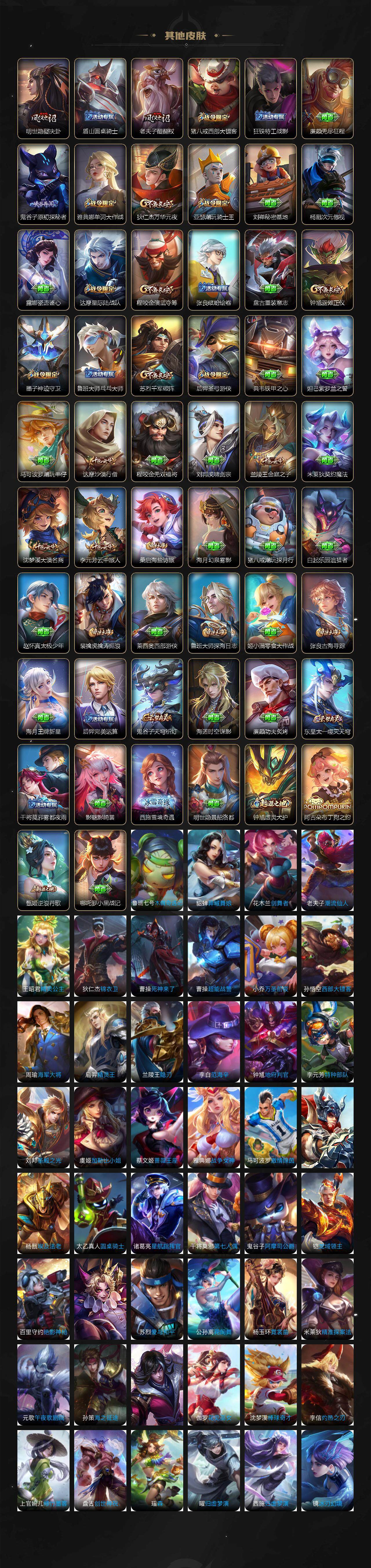 【赛季限定】:白起狰,芈月重明,夏侯惇朔风刀,曹操烛龙,典韦穷奇,狄仁杰万华元夜,达摩沙漠行僧,老夫子醍醐杖,程咬金演武夺筹,兰陵王金庭之子,张良古海寻踪,牛魔御旌,李元芳云中旅人,钟馗驱傩正仪,雅典娜黎明之约,太乙真人饕餮,鬼谷子原初探秘者,苏烈千军破阵,百里玄策原初追逐者,弈星混沌棋,梦奇顽趣,沈梦溪大漠名