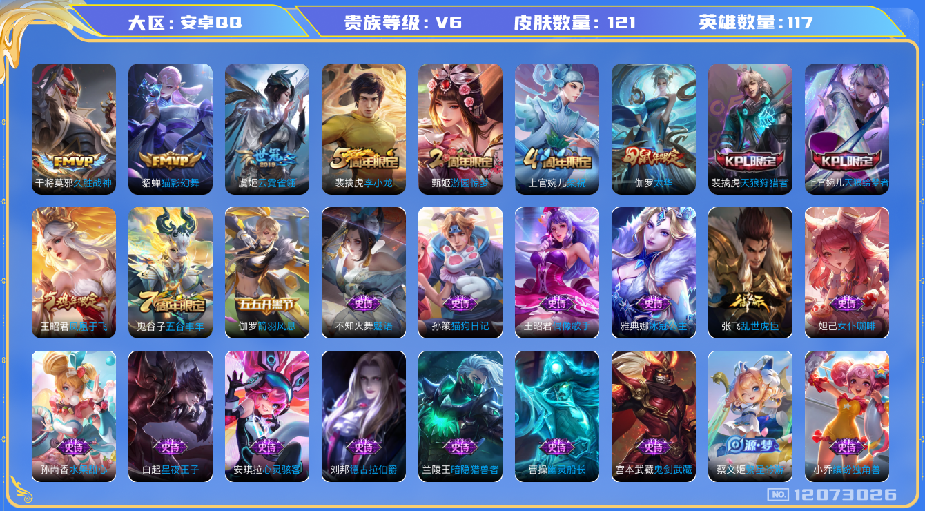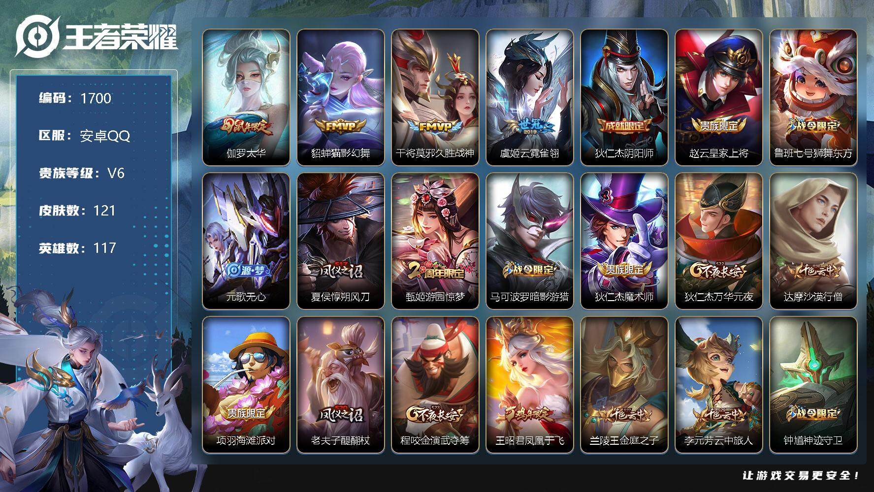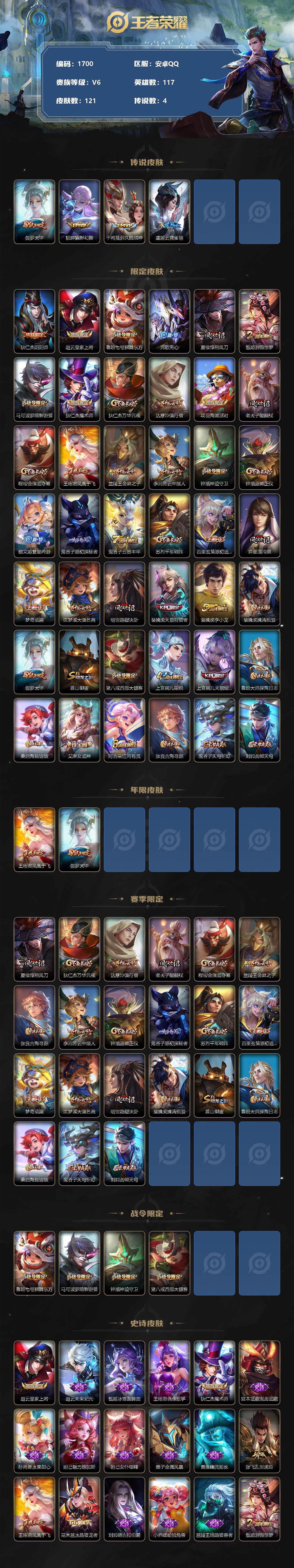 [12073026]【商品标题】:安卓Q-V0-尊贵铂金IV段位-117英雄-121皮肤-0典藏-0珍品无双-0无双-0珍品传说-4传说-38史诗