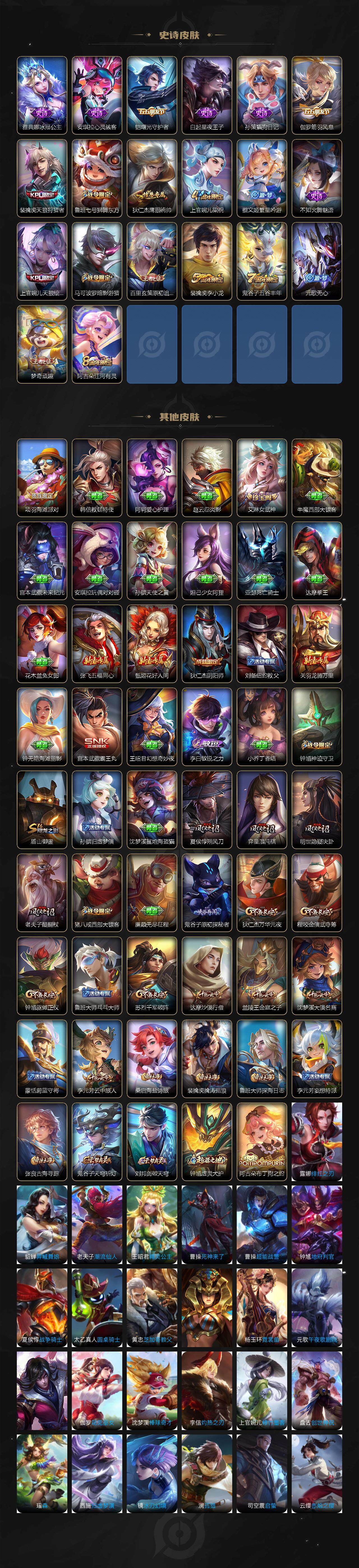 【史诗皮肤】:赵云皇家上将,赵云未来纪元,甄姬冰雪圆舞曲,王昭君偶像歌手,狄仁杰魔术师,宫本武藏鬼剑武藏,孙尚香水果甜心,妲己魅力维加斯,妲己女仆咖啡,墨子金属风暴,曹操幽灵船长,张飞乱世虎臣,王昭君凤凰于飞,花木兰水晶猎龙者,刘邦德古拉伯爵,小乔缤纷独角兽,兰陵王暗隐猎兽者,甄姬游园惊梦,雅典娜冰冠公主,安琪拉心灵骇客,铠曙光守护者,白起星夜王子,孙策猫狗日记,伽罗箭羽风息,裴擒虎天狼狩猎者,鲁班七号狮舞东方,狄仁杰鹰眼统帅,上官婉儿梁祝,蔡文姬繁星吟游,不知火舞魅语,上官婉儿天狼绘梦者,马可波罗暗影游猎,百里玄策原初追逐者,裴擒虎李小龙,鬼谷子五谷丰年,元歌无心,梦奇顽趣,阿古朵江河有灵