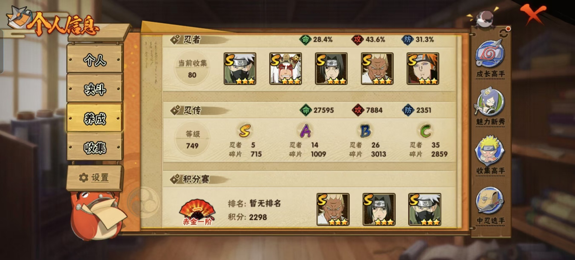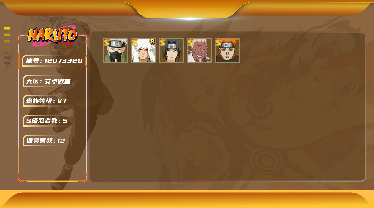 [12073320]V7 5S忍 14A忍 12通灵 273.9W战力 可二次 可修改实名 S级忍者:艾「忍界大战」,自来也 「舞之豪杰」,旗木卡卡西「须佐能乎」,宇智波鼬 「须佐能乎」,佩恩「天道」