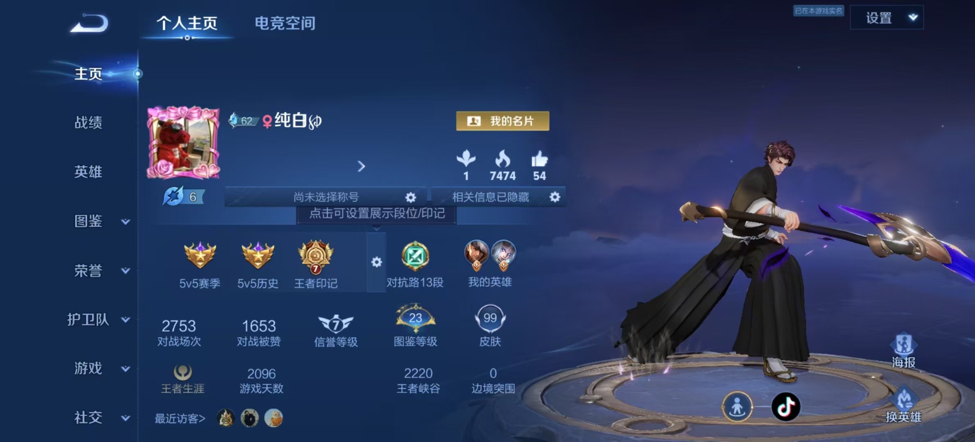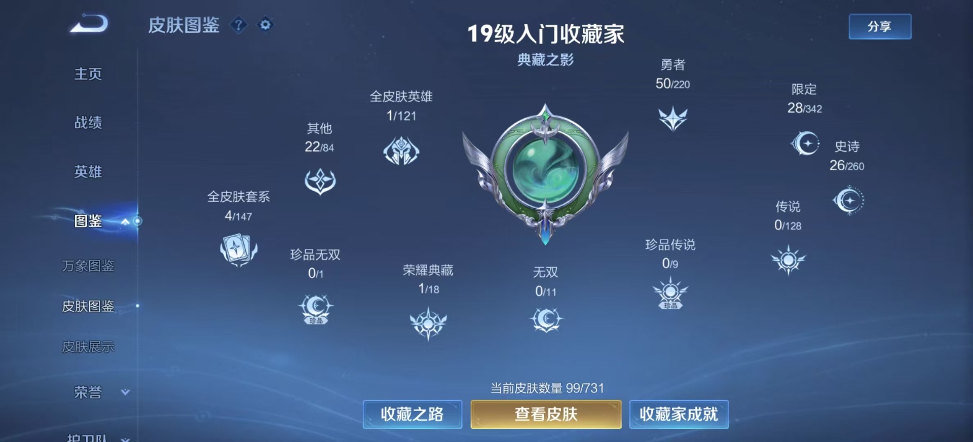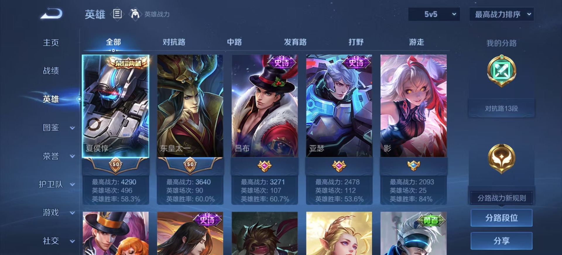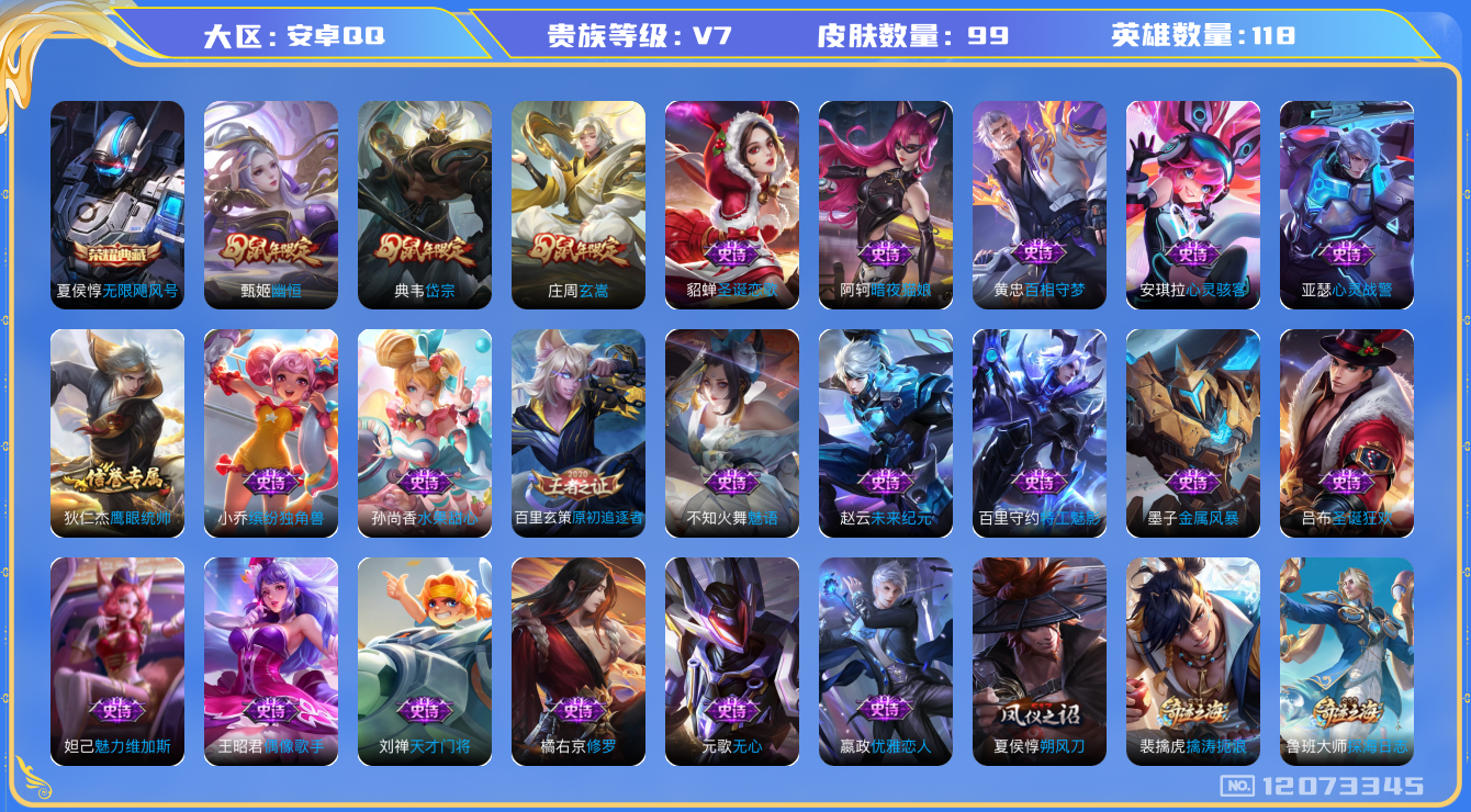 - [12087987]实名: 可修改 贵族等级: V9 英雄数: 125 皮肤数: 261 荣耀水晶: 鸣剑·曳影 无双皮: 器灵·螭龙剑 传说皮: 绛天战甲,炽阳神光,一念神魔,云霓雀翎,末日机甲-孙尚香,地狱火,零号·赤焰,地狱之眼,时之恋人-刘备,无双飞将,山海·炽霜斩,山海·苍雷引,妄想实况,鹤归松栖(云缨),幻光神枪,祥瑞亨通 限定皮: 李小龙,祈雪灵祝,梁祝,御风骁将,时雨天司,龙胆,烈魂,白晶晶,飞衡,凤求凰,至尊宝,默契交锋-兰陵王,默契交锋-花木兰,深海之息,枫霜尽,五谷丰年,诗剑行,山海·玄木吟,鸣野蒿,愿照·九州拓
