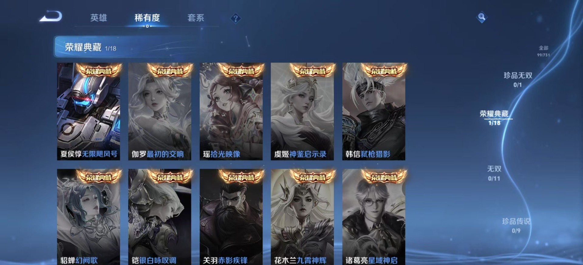 夏侯惇朔风刀,裴擒虎擒涛扼浪,鲁班大师探海日志,老夫子醍醐杖,沈梦溪星空之诺,明世隐疑决卦,鬼谷子原初探秘者,张良古海寻踪,桑启海盐诗旅,狄仁杰万华元夜,程咬金演武夺筹,达摩沙漠行僧,李元芳银河之约,李元芳云中旅人,弈星混沌棋,钟馗驱傩正仪