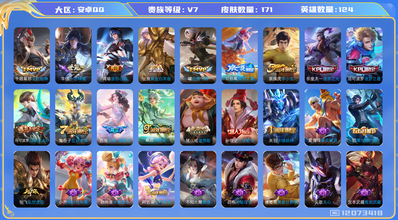 [12073418]V7 6传说 124英雄 171皮肤 可修改实名 优质装备:云鹰飞将(小将军),黄金白羊座,久胜战神,一念神魔,音你心动-周瑜 珍宝阁皮:优雅恋人,玩趣恶龙 限定皮:鸣野蒿,至美·乘鲤谣,五谷丰年,冰锋战神,逐梦之星,李小龙,逐梦之光,猪悟能,大圣娶亲,蜜橘之夏,山海·玄木吟(马可年限) 史诗皮:白龙吟,黄金分割率,特工魅影,江河有灵,魅语,百解令(蒙犽),乱世虎臣,修罗,水果甜心,暗隐猎兽者,鬼剑武藏,繁星吟游(呼啦呼啦),拒霜思,缤纷独角兽,乘风破浪,逐浪之夏,水晶猎龙者,曙光守护者,热力回旋,金属风暴,圣诞狂欢,圣诞恋歌,鹰眼统帅,魅力维加斯,黎明之约,无心