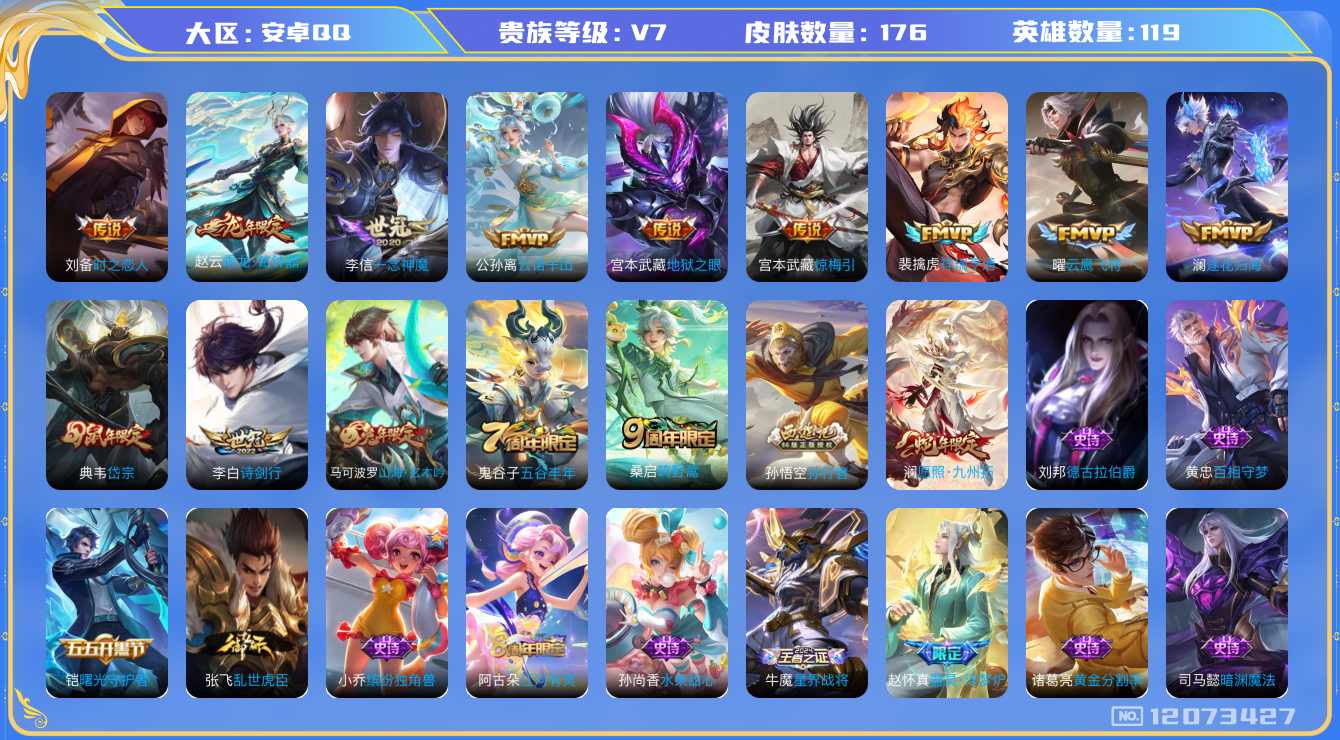 [12073427]V7 12传说 119英雄 176皮肤 可修改实名 优质装备:云鹰飞将(小将军),一念神魔,地狱之眼,时之恋人-刘备(电焊工),惊梅引,澜逐花归海 传说皮:乘龙·铭钟鼎(赵云年限),云诺千山,祥瑞亨通 珍宝阁皮:妄想食味 限定皮:愿照·九州拓(澜年限),鸣野蒿,诗剑行,五谷丰年,岱宗(典韦年限),孙行者,山海·玄木吟(马可年限) 史诗皮:赞萌露比,器灵·浮梦炉,星界战将,龙之律动,东方月初,蒙犽顽岩魄,芈月浮光幕影,上官婉儿群星魔术团,星界特工,百相守梦-黄忠,黄金分割率,江河有灵,百解令(蒙犽),乱世虎臣,修罗,摇滚巨星,水果甜心,绅士熊喵,功夫厨神,德古拉伯爵,暗隐猎兽者,鬼剑武藏,暗渊魔法,天秀·启明,纤云弄巧,缤纷独角兽,水晶猎龙者,曙光守护者,鹰眼统帅,暗夜贵公子,魅力维加斯,赏金猎手