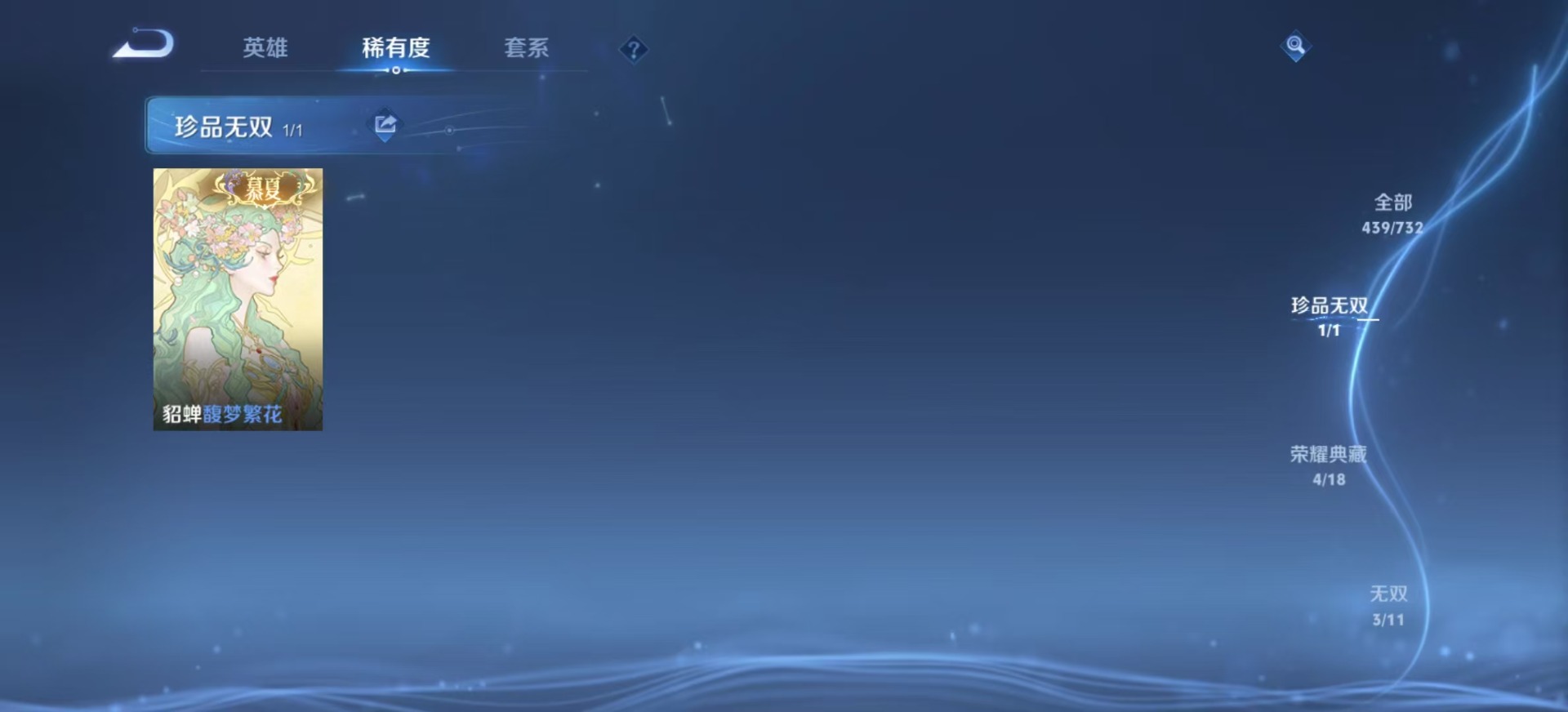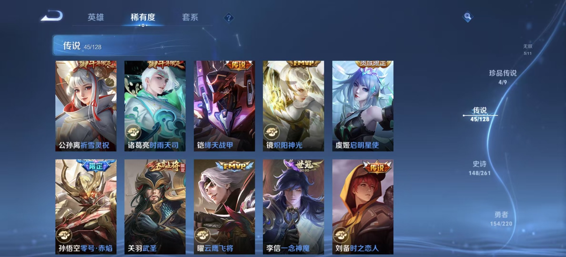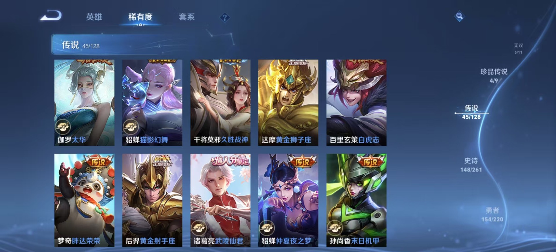 大乔白鹤梁神女,黄忠烈魂,哪吒逐梦之翼,甄姬幽恒,铠青龙志,伽罗太华,张飞虎魄,赵云龙胆,孙膑天狼运算者,干将莫邪冰霜恋舞曲,典韦岱宗,牛魔奔雷神使,鲁班七号乒乒小将,项羽霸王别姬,吕布御风骁将,后羿辉光之辰,露娜一生所爱,庄周玄嵩,诸葛亮时雨天司,兰陵王默契交锋,公孙离祈雪灵祝,公孙离蜜橘之夏,裴擒虎梅西,裴擒虎李小龙,上官婉儿梁祝,上官婉儿天狼绘梦者,李白诗剑行,花木兰默契交锋,花木兰青春决赛季,马可波罗逐梦之星,马可波罗山海·玄木吟,孙悟空孙行者,孙悟空大圣娶亲,芈月白晶晶,孙悟空至尊宝,百里玄策白虎志,马超神威,雅典娜神奇女侠,妲己时之彼端,韩信飞衡,蔡文姬奇迹圣诞,蔡文姬愿照·福禄聚,瑶时之祈愿,瑶山海·碧波行,澜愿照·九州拓,虞姬霸王别姬,嫦娥如梦令,王昭君凤凰于飞,关羽武圣