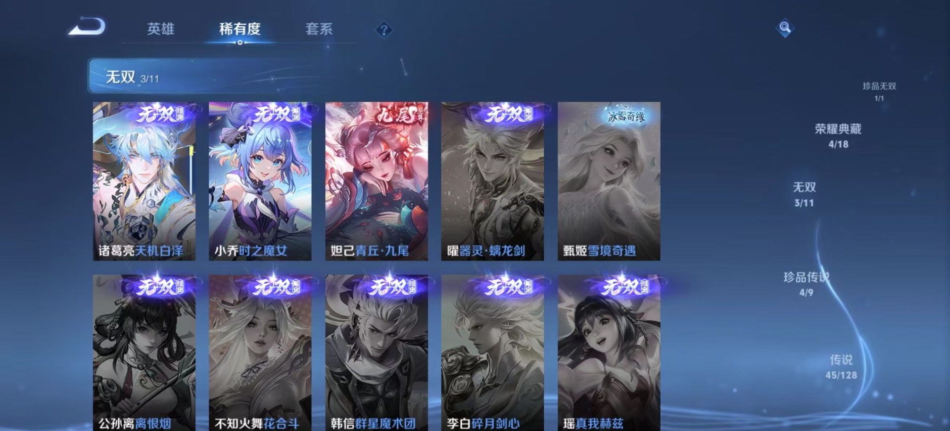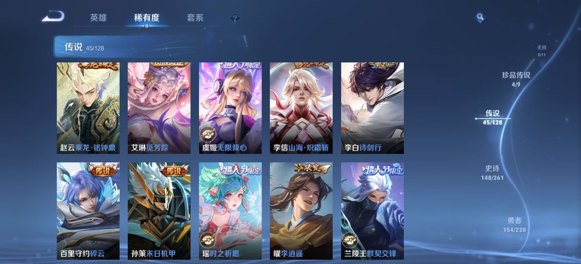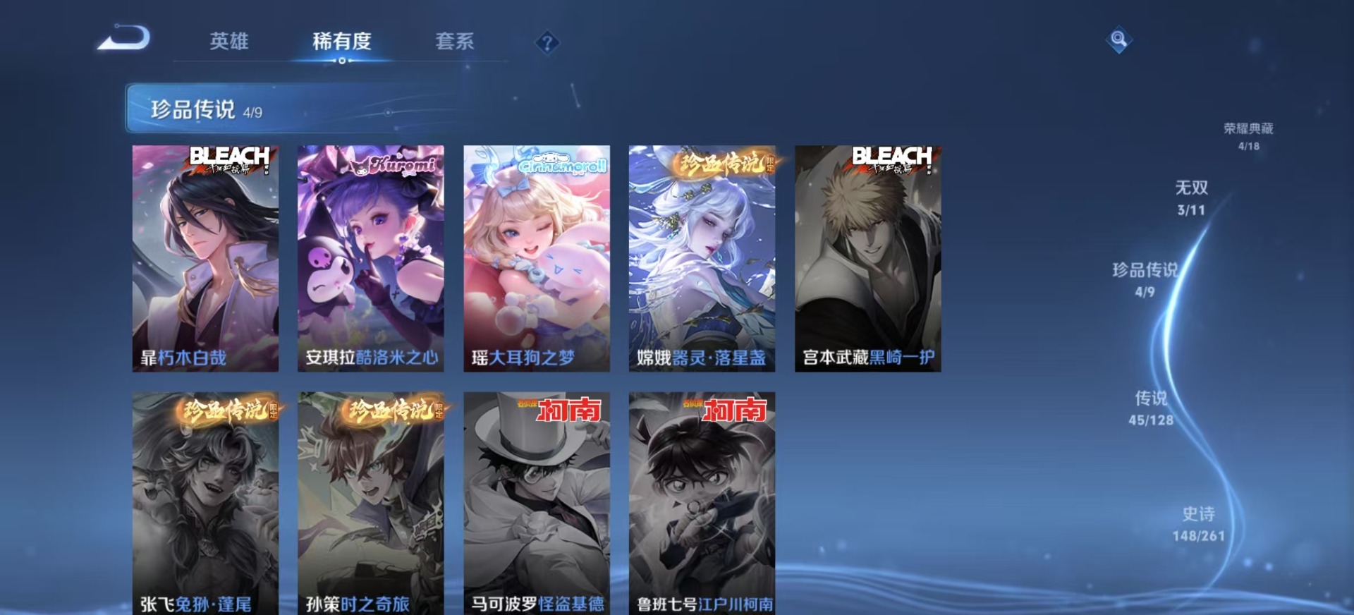 - PX_2068039-05 苹果QQ/非凡王者/286皮肤/124英雄/2典藏/0珍品无双/1无双/2珍品传说/19传说/86史诗/9稀有英雄 【2 珍品传说】大耳狗之梦 瑶,江户川柯南 鲁班七号, 【2 典藏皮肤】鸣剑·曳影 李白,无限飓风号 夏侯惇, 【1 无双皮肤】时之魔女 小乔, 【19 传说皮肤】启明星使 虞姬,无双飞将 马超,白虎志 百里玄策,零号·赤焰 孙悟空,云鹰飞将 曜,凤求凰