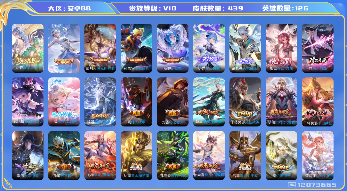 [12073665]V10 4典藏 1珍品无双 3无双 4珍品传说 45传说 126英雄 439皮肤 典藏英雄武则天 女号 可修改实名 优质装备:馥梦繁花,倪克斯神谕(宇宙婆娘),全息碎影(猴子典藏),幻阙歌(貂蝉典藏),青丘·九尾(妲己无双),小乔时之魔女(小乔无双),最初的交响(伽罗典藏),天机白泽,器灵·落星盏,酷洛米之心,大耳狗之梦,朽木白哉,黄金狮子座,黄金射手座,云鹰飞将(小将军),绛天战甲(鸡嘴战神),猫影幻舞,久胜战神,炽阳神光,一念神魔,末日机甲-孙尚香(绿蚂蚱),地狱火,仲夏夜之梦(大飞蛾),零号·赤焰,海洋之心,地狱之眼,胖达荣荣,李逍遥,时之恋人-刘备(电焊工),超时空战士-狄仁杰,末日机甲-孙策,碎云,山海·炽霜斩(李信年限),青丘·九尾,艾琳觅芳踪,朵莉亚心动手记,诡秘之主,千山共赴,涂山容容 传说皮:乘龙·问璇玑(孙尚香年限),乘龙·铭钟鼎(赵云年限),乘龙·淬吴钩(孙策年限),貂蝉曦玄引,续相思,幻光神枪 珍宝阁皮:蔷薇恋人,女武神 限定皮:愿照·九州拓(澜年限),愿照·福禄聚(蔡文姬年限),至尊宝,白虎志(电光耗子),凤凰于飞,太华(伽罗年限),梅西,武陵仙君(小桃花),时之彼端,白鹤梁神女,白晶晶,时雨天司(水龙头),神威(电光马子),飞衡(韩信年限),玄嵩(庄周年限),山海·碧波行(瑶年限),遇见飞天,高山流水,诗剑行,无限倾心-虞姬,五谷丰年,青龙志(铠年限),幽恒(沐浴露),武圣,天狼运算者,梁祝,御风骁将(吕布年限),龙胆,逐梦之翼,逐梦之星,烈魂,岱宗(典韦年限),虎魄,奔雷神使(牛魔年限),祈雪灵祝(雪兔子),天狼绘梦者,李小龙,辉光之辰,如梦令-嫦娥,霸王别姬-项羽,霸王别姬-虞姬,奇迹圣诞,默契交锋-兰陵王,默契交锋-花木兰,孙行者,一生所爱,大圣娶亲,天魔缭乱,青春决赛季,冰霜恋舞曲,乒乒小将,蜜橘之夏,神奇女侠,时之祈愿-瑶(瑶传限),山海·玄木吟(马可年限) 史诗皮:赞萌露比,鸭鸭历险记-刘禅,器灵·浮梦炉,狼魂孤将,灵蛊蚀心,龙之律动,石田雨龙,百相守梦-周瑜,茶境仙,幻珠鲛人,琥珀纪元伽罗,蔬乡物语(鲁班七号),乘龙·聚宝船(安琪拉年限),乘龙·忆丹青(大乔年限),百相守梦-黄忠,织梦人,守夜人,遇见神鹿,紫霞仙子,苍穹之光,电玩小子(小书包),白龙吟,黄金分割率,特工魅影,千年之狐,永昼,江河有灵,