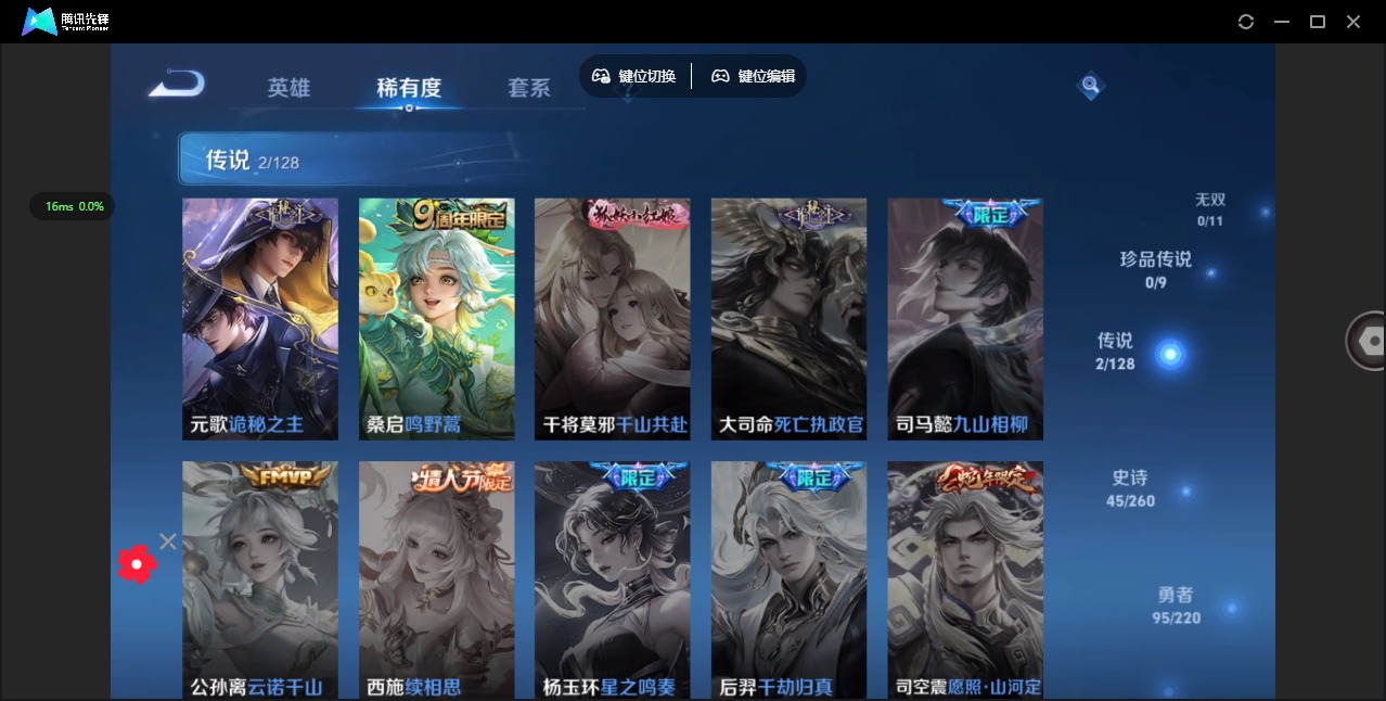 - [12233897]V6 2珍品传说 7传说 93英雄 75皮肤 可修改实名 优质装备:怪盗基德,器灵·落星盏,久胜战神,无双飞将,澜逐花归海 传说皮:祥瑞亨通 限定皮:愿照·九州拓(澜年限),愿照·山河定(司空震年限),逐霄战戟,鸣野蒿 史诗皮:百相守梦-百里守约,水果甜心,心灵骇客,鬼剑武藏,缤纷独角兽,水晶猎龙者,箭羽风息,原初追逐者