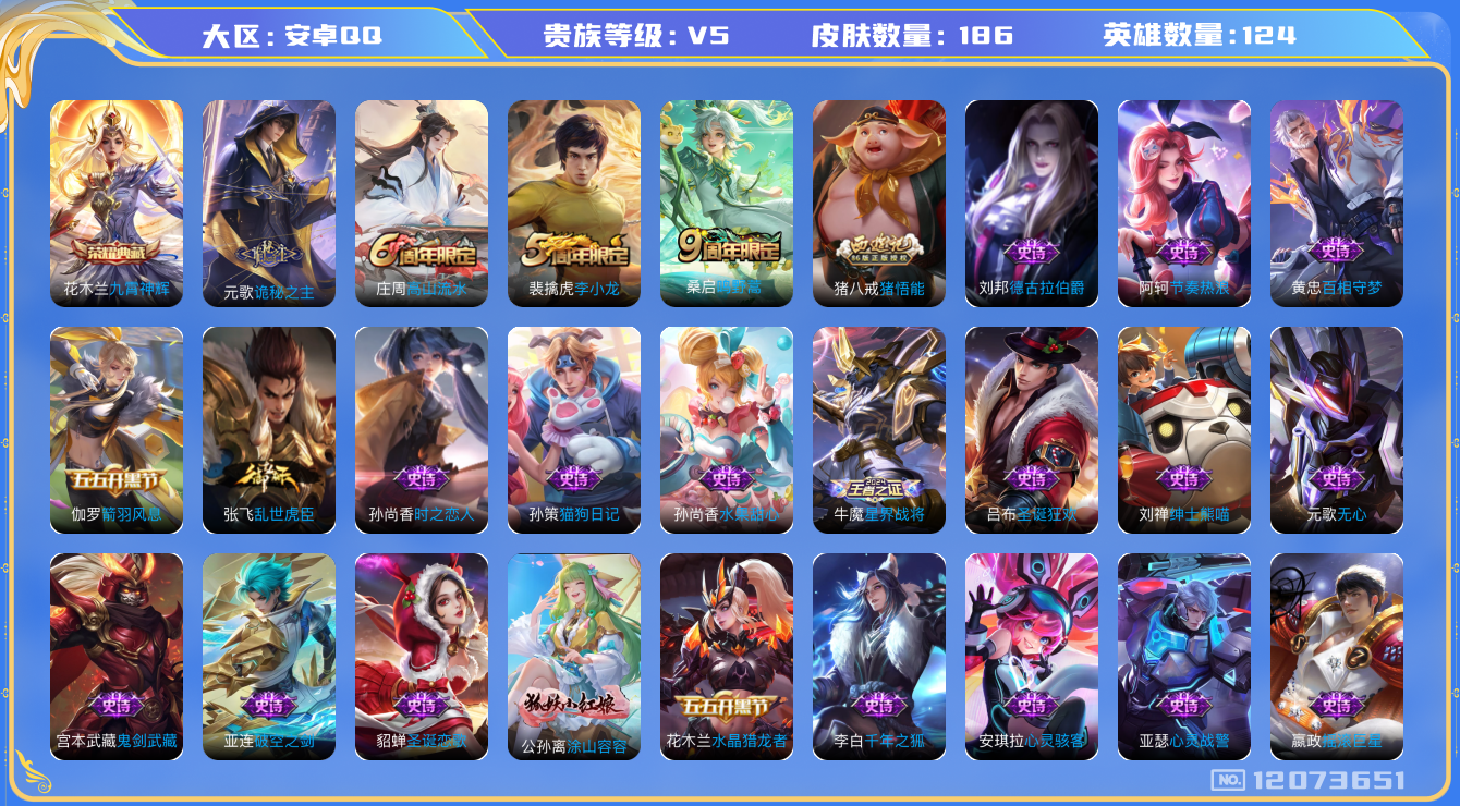 - [12235668]V8 3典藏 13传说 125英雄 297皮肤 可修改实名 优质装备:全息碎影(猴子典藏),九霄神辉(木兰典藏),弑枪猎影(韩信典藏),黄金射手座,猫影幻舞,久胜战神,炽阳神光,仲夏夜之梦(大飞蛾),乞巧织情,山海·苍雷引(电光曜子),涂山容容 珍宝阁皮:蔷薇恋人,女武神,玩趣恶龙 限定皮:愿照·山河定(司空震年限),逐霄战戟,鸣野蒿,至尊宝,傲雪梅枪,遇见飞天,高山流水,五谷丰年,青龙志(铠年限),梁祝,天狼狩猎者,烈魂,李小龙,孙行者,乒乒小将,寅虎·瑞焰(虎皮蛋子),寅虎·赤拳(老虎年限),深海之息(深海大菠萝) 史诗皮:糖绘人间,化蝶舞,灵蛊蚀心,星界战将,茶境仙,怒海争锋,蔬乡物语(鲁班七号),紫霞仙子,苍穹之光,黄金分割率,特工魅影,千年之狐,江河有灵,浮梦罗烟,魅语,百解令(蒙犽),蒙恬荣光圣徽,偶像歌手,晚萤,电玩·爆裂旋风,末日机甲-吕布,猫狗日记-孙策,猫狗日记-大乔,乱世虎臣,节奏热浪,女仆咖啡,摇滚巨星,水果甜心,天才门将,星夜王子,心灵骇客,时之奇旅-安琪拉,功夫厨神,德古拉伯爵,暗隐猎兽者,幽灵船长,鬼剑武藏,心灵战警,乐园奇幻夜,舞动绿茵,地狱岩魂,纤云弄巧,缤纷独角兽,乘风破浪,逐浪之夏,水晶猎龙者,曙光守护者,箭羽风息,金属风暴,原初追逐者,圣诞狂欢,圣诞恋歌,鹰眼统帅,暗夜贵公子,魅力维加斯,赏金猎手,无心,未来纪元-赵云,玫瑰异探
