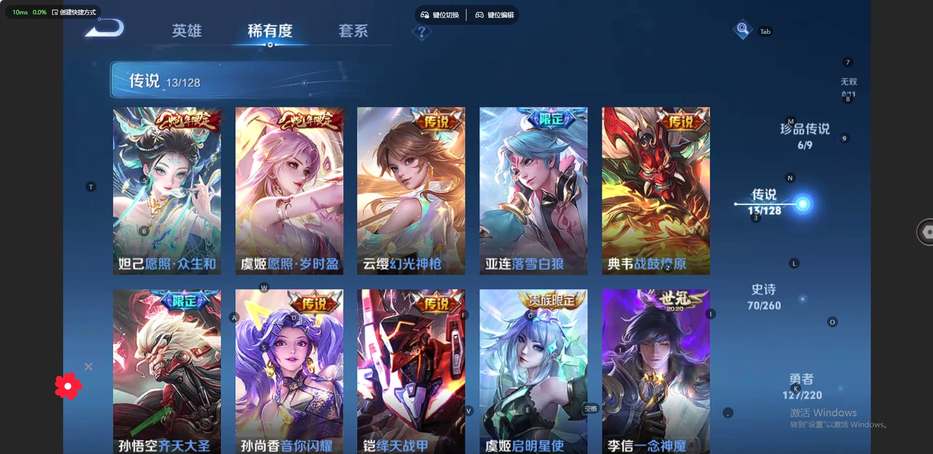 - [11882457]V7 1典藏 6传说 125英雄 332皮肤 可修改实名 女号 优质装备:全息碎影(猴子典藏),地狱火,胖达荣荣 传说皮:乘龙·铭钟鼎(赵云年限),幻光神枪 珍宝阁皮:优雅恋人,蔷薇恋人,女武神 限定皮:愿照·九州拓(澜年限),逐霄战戟,鸣野蒿,飞衡(韩信年限),遇见飞天,高山流水,五谷丰年,梁祝,御风骁将(吕布年限),天狼征服者,李小龙,孙行者,猪悟能,引擎之心,冰霜恋舞曲,百木心枪,玉兔公主 史诗皮:化蝶舞,龙之律动,石田雨龙,谪仙醉月,决胜骁骑,蔬乡物语(鲁班七号),百相守梦-黄忠,紫霞仙子,电玩小子(小书包),白龙吟,黄金分割率,特工魅影,千年之狐,电玩·爆裂旋风,江河有灵,百解令(蒙犽),高渐离燃音魔法,晚萤,末日机甲-吕布,猫狗日记-孙策,猫狗日记-大乔,时之恋人-孙尚香,节奏热浪,修罗,女仆咖啡,摇滚巨星,水果甜心,绅士熊喵,星夜王子,心灵骇客,德古拉伯爵,暗隐猎兽者,幽灵船长,鬼剑武藏,暗渊魔法,心灵战警,天秀·启明,舞动绿茵,地狱岩魂,纤云弄巧,繁星吟游(呼啦呼啦),拒霜思,缤纷独角兽,乘风破浪,逐浪之夏,水晶猎龙者,曙光守护者,热力回旋,金属风暴,圣诞狂欢,圣诞恋歌,鹰眼统帅,暗夜贵公子,无心,未来纪元-赵云
