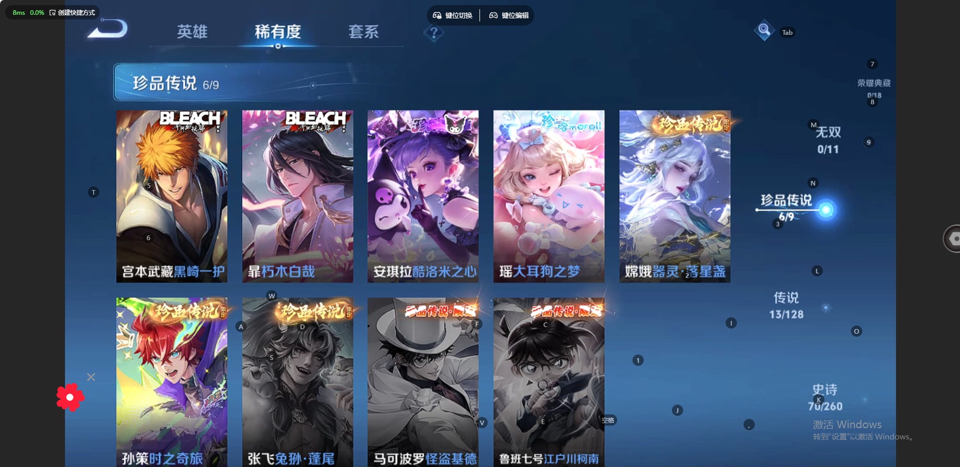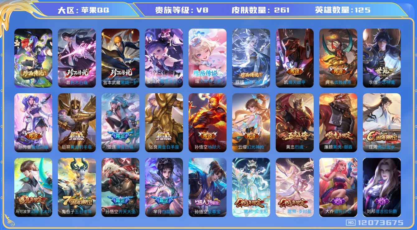 [12073675]V8 6珍品传说 13传说 125英雄 261皮肤 可修改实名 优质装备:器灵·落星盏,酷洛米之心,大耳狗之梦,朽木白哉,黑崎一护,黄金射手座,绛天战甲(鸡嘴战神),黄金白羊座,一念神魔,地狱火,音你闪耀(rap皮),涂山容容 珍品传说:时之奇旅-孙策 传说皮:典韦战鼓燎原,落雪白狼,幻光神枪 珍宝阁皮:蔷薇恋人 限定皮:愿照·岁时盈(虞姬年限),愿照·众生和(妲己年限),至尊宝,白晶晶,高山流水,齐天大圣,五谷丰年,烈魂,寅虎·御盾(廉颇年限),山海·玄木吟(马可年限) 史诗皮:赞萌露比,鸭鸭历险记-刘禅,苍鳞隐世,器灵·浮梦炉,糖绘人间,狼魂孤将,绮世丹青,瑰影绮梦,化蝶舞,龙之律动,小牛鸭,石田雨龙,百相守梦-周瑜,戍鼓铭心,茶境仙,芈月浮光幕影,百相守梦-百里守约,百相守梦-黄忠,紫霞仙子,电玩小子(小书包),黄金分割率,千年之狐,永昼,江河有灵,末日机甲-莱西奥,百解令(蒙犽),蒙恬荣光圣徽,龙骑士(小龙虾),末日机甲-吕布,猫狗日记-大乔,时之恋人-孙尚香,女仆咖啡,摇滚巨星,水果甜心,星夜王子,德古拉伯爵,暗隐猎兽者,幽灵船长,鬼剑武藏,心灵战警,地狱岩魂,诗语江南,纤云弄巧,缤纷独角兽,乘风破浪,逐浪之夏,曙光守护者,箭羽风息,金属风暴,圣诞狂欢,鹰眼统帅,赏金猎手,寅虎·御盾,无心,未来纪元-赵云
