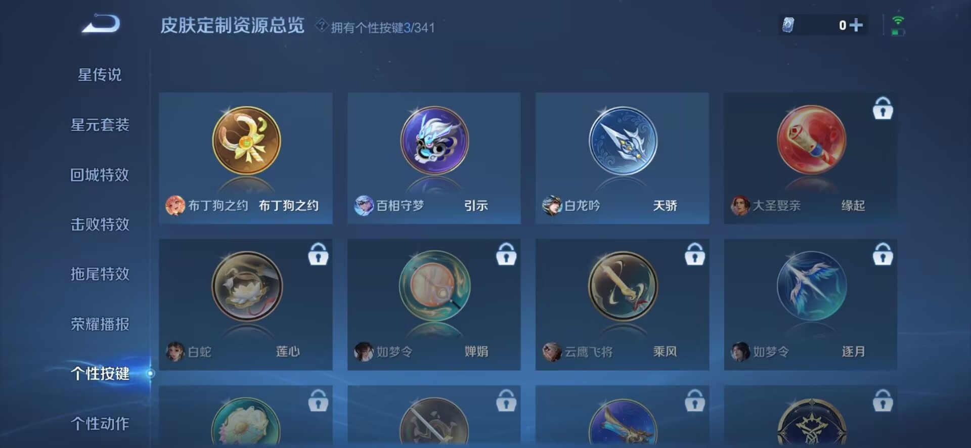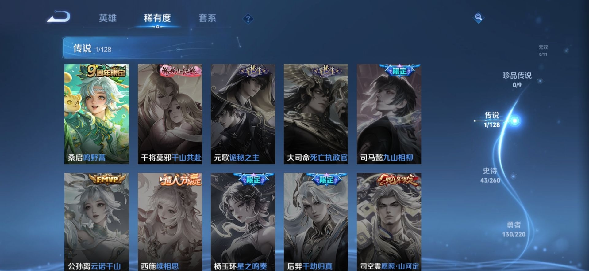 大乔猫狗日记,刘邦德古拉伯爵,夏侯惇乘风破浪,铠曙光守护者,刘备百相守梦,曹操幽灵船长,小乔缤纷独角兽,项羽苍穹之光,露娜紫霞仙子,吕布末日机甲,刘禅电玩·爆裂旋风,刘禅天才门将,宫本武藏鬼剑武藏,兰陵王暗隐猎兽者,花木兰水晶猎龙者,李白千年之狐,蒙犽百解令,雅典娜冰冠公主,韩信白龙吟,百里守约特工魅影,墨子龙骑士,墨子金属风暴,嫦娥拒霜思