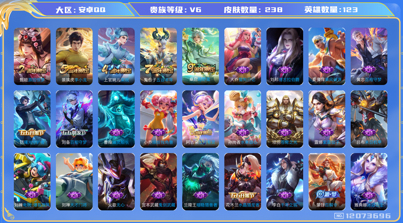 - PX_2093804-贵族6/皮肤96/传说4/史诗24/英雄98/蔷薇恋人/炽阳神光/无双飞将/裴擒虎祥瑞亨通/澜愿照九州拓/姜子牙天穹之誓/李白谪仙醉月/赵云皇家上将/蔷薇恋人/狄仁杰魔术师/项羽海滩派对/金庭之子/云中旅人/梦奇顽趣/大漠名商/擒涛扼浪/探海日志/海盐诗旅/古海寻踪/蒙恬荣光圣徽/天穹祈灯/刘邦剑破天穹/刘备异域游侠/金庭之子/古海寻踪/云中旅人/梦奇顽趣/大漠名商/擒涛扼浪