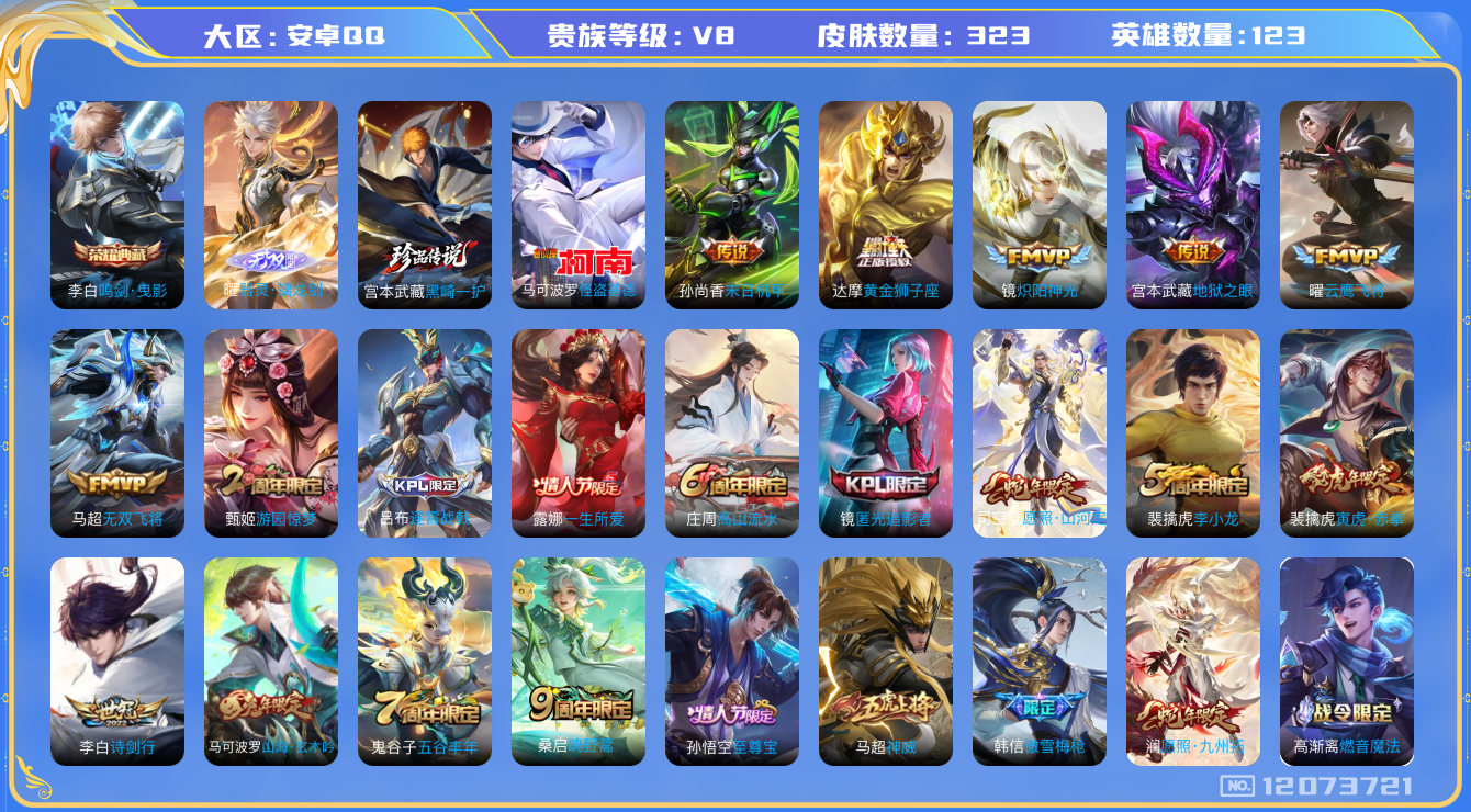 [12073721]V8 1典藏 1无双 2珍品传说 12传说 123英雄 323皮肤 可修改实名 优质装备:鸣剑·曳影,器灵·螭龙剑,怪盗基德,黑崎一护,黄金狮子座,云鹰飞将(小将军),炽阳神光,末日机甲-孙尚香(绿蚂蚱),地狱之眼,无双飞将,涂山容容 珍宝阁皮:妄想食味,玩趣恶龙 限定皮:愿照·九州拓(澜年限),愿照·山河定(司空震年限),逐霄战戟,鸣野蒿,至尊宝,傲雪梅枪,神威(电光马子),高山流水,诗剑行,五谷丰年,游园惊梦,李小龙,一生所爱,匿光追影者,寅虎·赤拳(老虎年限),山海·玄木吟(马可年限) 史诗皮:鸭鸭历险记-刘禅,器灵·浮梦炉,化蝶舞,星界战将,谪仙醉月,龙之律动,石田雨龙,百相守梦-周瑜,茶境仙,破空之剑,战舞者,东方月初,蒙犽顽岩魄,埋骨钱,蔬乡物语(鲁班七号),超元猎域,百相守梦-百里守约,百相守梦-黄忠,织梦人,紫霞仙子,苍穹之光,黄金分割率,特工魅影,千年之狐,永昼,江河有灵,魅语,百解令(蒙犽),高渐离燃音魔法,蒙恬荣光圣徽,无限星赏官,冰冠公主,晚萤,电玩·爆裂旋风,末日机甲-吕布,乱世虎臣,节奏热浪,修罗,女仆咖啡,摇滚巨星,水果甜心,绅士熊喵,天才门将,星夜王子,心灵骇客,功夫厨神,暗隐猎兽者,幽灵船长,鬼剑武藏,暗渊魔法,乐园奇幻夜,舞动绿茵,地狱岩魂,纤云弄巧,拒霜思,缤纷独角兽,乘风破浪,逐浪之夏,月团寄思,水晶猎龙者,曙光守护者,热力回旋,箭羽风息,金属风暴,原初追逐者,圣诞狂欢,圣诞恋歌,鹰眼统帅,暗夜贵公子,魅力维加斯,黎明之约,赏金猎手,无心