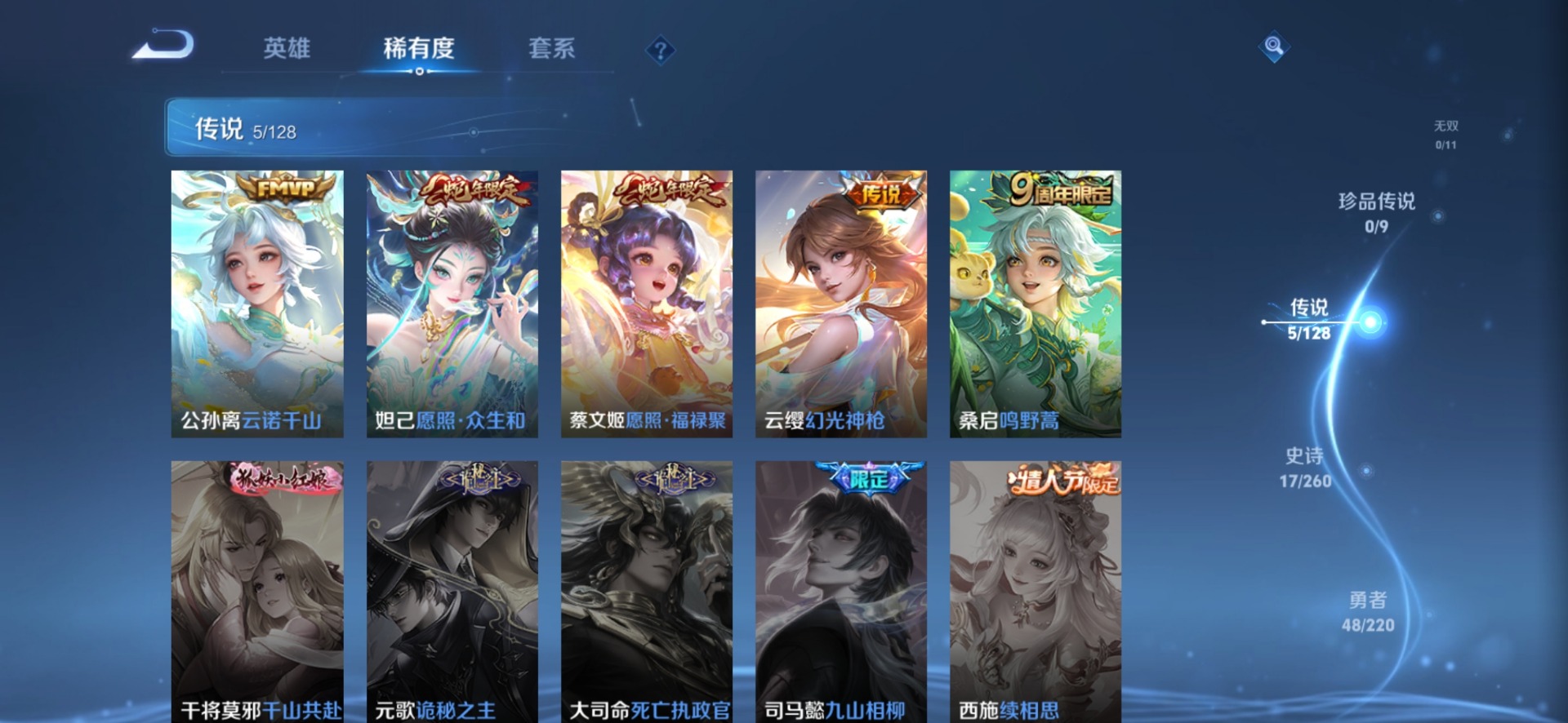 - [11715025]V7 2珍品传说 8传说 123英雄 179皮肤 可修改实名 优质装备:器灵·落星盏,朽木白哉,黄金狮子座,黄金射手座,黄金白羊座,地狱之眼,涂山容容 传说皮:乘龙·铭钟鼎(赵云年限),落雪白狼 珍宝阁皮:胡桃夹子 限定皮:愿照·九州拓(澜年限),愿照·山河定(司空震年限),飞衡(韩信年限),降魔,五谷丰年,天狼狩猎者,李小龙,冰霜恋舞曲,山海·玄木吟(马可年限) 史诗皮:器灵·浮梦炉,化蝶舞,龙之律动,石田雨龙,百相守梦-黄忠,织梦人,紫霞仙子,黄金分割率,特工魅影,千年之狐,永昼,魅语,百解令(蒙犽),偶像歌手,暗夜猫娘,末日机甲-吕布,猫狗日记-孙策,时之恋人-孙尚香,乱世虎臣,修罗,女仆咖啡,摇滚巨星,水果甜心,功夫厨神,鬼剑武藏,舞动绿茵,纤云弄巧,水晶猎龙者,曙光守护者,金属风暴,圣诞狂欢,鹰眼统帅,黎明之约