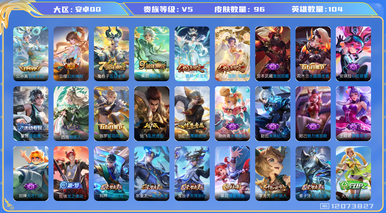 [12073827]V5 5传说 104英雄 96皮肤 可修改实名 女号 传说皮:云诺千山,幻光神枪 限定皮:愿照·福禄聚(蔡文姬年限),愿照·众生和(妲己年限),鸣野蒿,五谷丰年 史诗皮:龙之律动,蒙犽顽岩魄,织梦人,偶像歌手,乱世虎臣,水果甜心,天才门将,心灵骇客,鬼剑武藏,水晶猎龙者,箭羽风息,鹰眼统帅,魅力维加斯,未来纪元-赵云