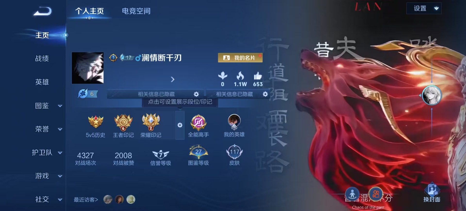- [12221342]V6 5传说 111英雄 87皮肤 可修改实名 优质装备:黄金狮子座,炽阳神光,地狱之眼,山海·炽霜斩(李信年限) 珍宝阁皮:玩趣恶龙 限定皮:齐天大圣,五谷丰年,山海·玄木吟(马可年限) 史诗皮:蒙恬荣光圣徽,冰冠公主,末日机甲-吕布,绅士熊喵,暗隐猎兽者,幽灵船长,暗渊魔法,水晶猎龙者,金属风暴,原初追逐者,鹰眼统帅,无心,玫瑰异探