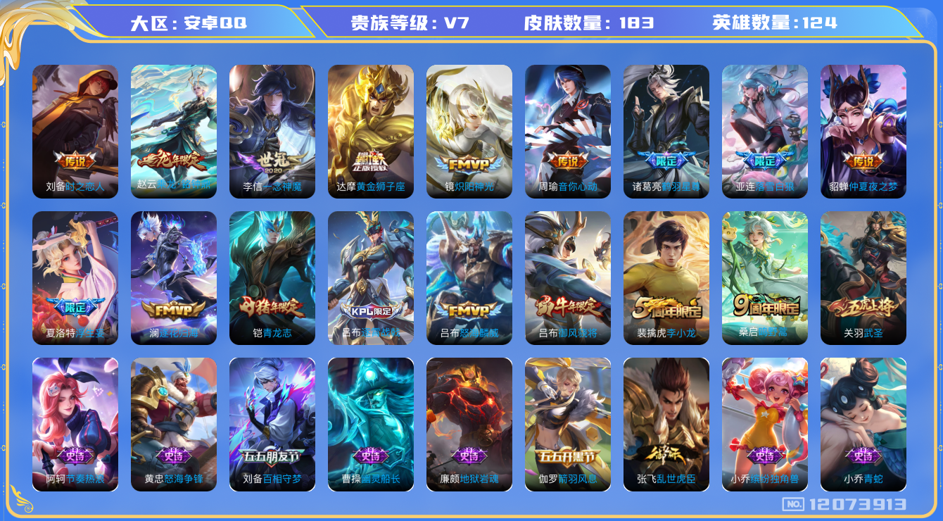 - [11863871]V10 7典藏 55传说 126英雄 442皮肤 典藏英雄武则天 可修改实名 优质装备:天鹅之梦(小乔典藏),星空梦想(太空人),无限飓风号(高达),鸣剑·曳影,全息碎影(猴子典藏),九霄神辉(木兰典藏),银白咏叹调(倪克斯侍卫),黄金狮子座,黄金射手座,冠军飞将,云鹰飞将(小将军),绛天战甲(鸡嘴战神),黄金白羊座,猫影幻舞,久胜战神,炽阳神光,一念神魔,云霓雀翎,末日机甲-孙尚香(绿蚂蚱),地狱火,仲夏夜之梦(大飞蛾),地狱之眼,飞鸢探春,胖达荣荣,时之恋人-刘备(电焊工),游龙清影(小青龙),淬星耀世,超时空战士-狄仁杰,遇见胡旋,末日机甲-孙策,花朝如约(花篮子),无双飞将,音你闪耀(rap皮),碎云,神器·狴犴令,山海·炽霜斩(李信年限),山海·琳琅生(小乔年限),山海·苍雷引(电光曜子),炽翼辉光(娃娃菜牛角包),浮生妄,艾琳觅芳踪,涂山容容 珍宝阁皮:妄想食味,胡桃夹子,蔷薇恋人,女武神 限定皮:鸣野蒿,夏侯惇霜北刀,武陵仙君(小桃花),异界灵契(白毛香),傲雪梅枪,寅虎·展翼(孙膑年限),前尘镜,星穹之声,绯月行,魔法小厨娘,白晶晶,时雨天司(水龙头),神威(电光马子),飞衡(韩信年限),玄嵩(庄周年限),山海·碧波行(瑶年限),瑞麟志(木兰年限),高山流水,诗剑行,齐天大圣,匿光决锋者,怒海麟威,降魔,五谷丰年,青龙志(铠年限),幽恒(沐浴露),武圣,天狼运算者,梁祝,御风骁将(吕布年限),天狼狩猎者,龙胆,烈魂,岱宗(典韦年限),虎魄,祈雪灵祝(雪兔子),玄武志(苏烈年限),朱雀志(守约年限),永曜之星,辉光之辰,如梦令-嫦娥,如梦令-后羿,孙行者,猪悟能,青春决赛季,匿光追影者,女儿国国王,寅虎·御盾(廉颇年限),寅虎·瑞焰(虎皮蛋子),寅虎·心曲(虎婆),寅虎·赤拳(老虎年限),百木心枪,玉兔公主,启示之音,无尽星芒,深海之息(深海大菠萝),唐三藏,枫霜尽,匿光启智者,时之奇旅-妲己,神器·万象笔,梦圆繁星,山海·玄木吟(马可年限),冰霜神祇 史诗皮:灵蛊蚀心,星界战将,怒海争锋,撼地雄心,破空之剑,战舞者,蒙犽顽岩魄,蔬乡物语(鲁班七号),织梦人,遇见神鹿,紫霞仙子,苍穹之光,电玩小子(小书包),黄金分割率,特工魅影,千年之狐,永昼,江河有灵,真我赫兹(镜),魅语,百解令(蒙犽),高渐离燃音魔法,蒙恬荣光圣徽,无限星赏官,匿光破解者,冰