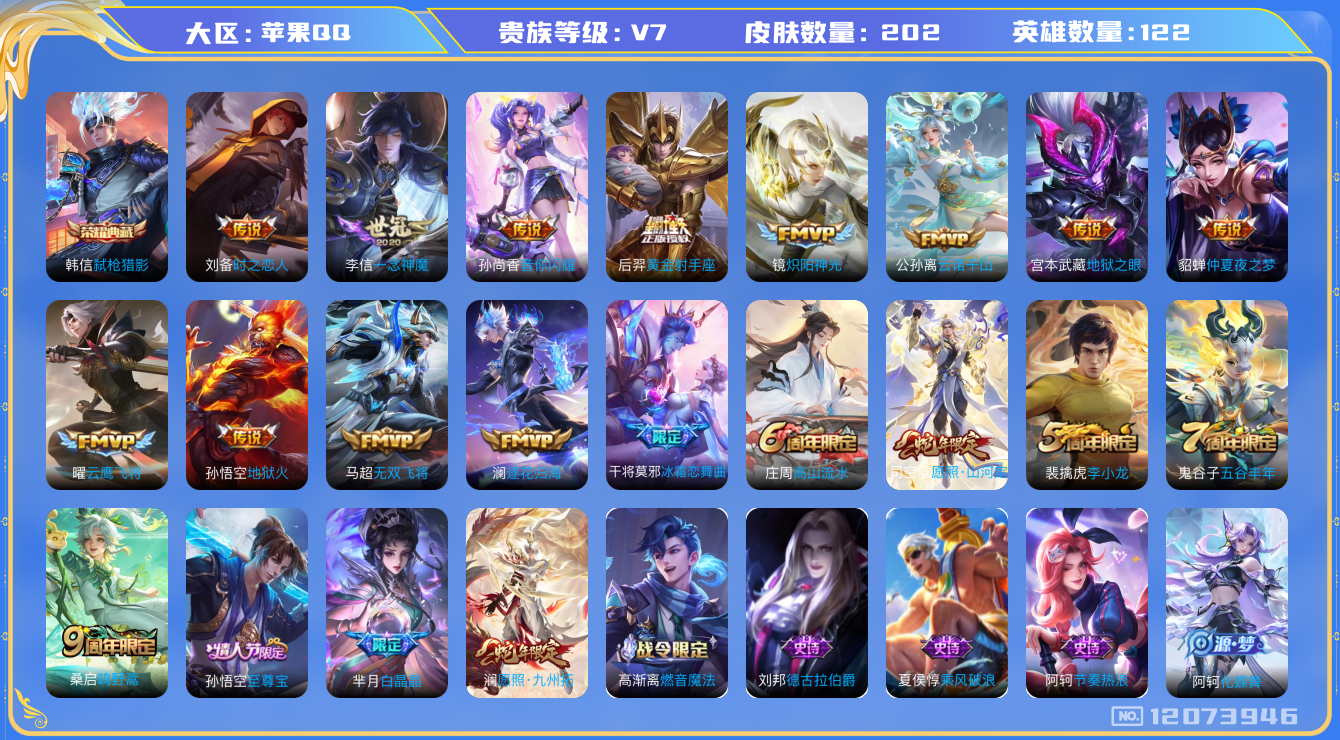 [12073946]V7 1典藏 15传说 122英雄 202皮肤 可修改实名 优质装备:弑枪猎影(韩信典藏),黄金射手座,云鹰飞将(小将军),炽阳神光,一念神魔,地狱火,仲夏夜之梦(大飞蛾),地狱之眼,时之恋人-刘备(电焊工),无双飞将,音你闪耀(rap皮),澜逐花归海,涂山容容 传说皮:云诺千山 珍宝阁皮:妄想食味,蔷薇恋人 限定皮:愿照·九州拓(澜年限),愿照·山河定(司空震年限),鸣野蒿,至尊宝,白晶晶,高山流水,五谷丰年,李小龙,冰霜恋舞曲 史诗皮:器灵·浮梦炉,化蝶舞,灵蛊蚀心,星界战将,龙之律动,石田雨龙,怒海争锋,破空之剑,东方月初,芈月浮光幕影,上官婉儿群星魔术团,百相守梦-百里守约,星界特工,百相守梦-黄忠,紫霞仙子,永昼,江河有灵,百解令(蒙犽),高渐离燃音魔法,蒙恬荣光圣徽,无限星赏官,末日机甲-吕布,猫狗日记-孙策,时之恋人-孙尚香,节奏热浪,水果甜心,天才门将,星夜王子,功夫厨神,德古拉伯爵,暗隐猎兽者,幽灵船长,鬼剑武藏,暗渊魔法,心灵战警,舞动绿茵,地狱岩魂,乘风破浪,水晶猎龙者,曙光守护者,箭羽风息,金属风暴,原初追逐者,圣诞狂欢,鹰眼统帅,魅力维加斯,黎明之约,未来纪元-赵云