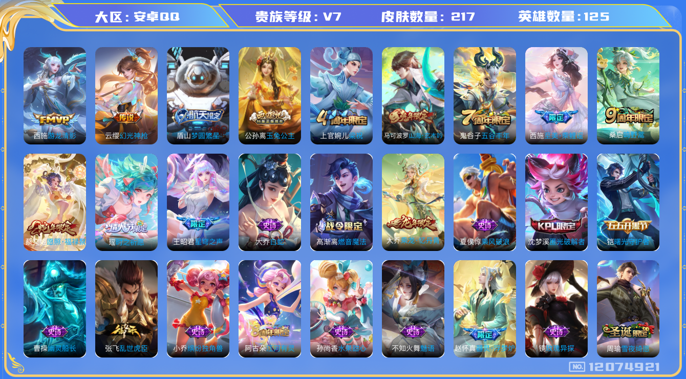 [12074921]V7 6传说 125英雄 217皮肤 可修改实名 优质装备:游龙清影(小青龙),涂山容容 传说皮:幻光神枪 珍宝阁皮:胡桃夹子,万物之道 限定皮:愿照·福禄聚(蔡文姬年限),鸣野蒿,星穹之声,至美·乘鲤谣,五谷丰年,梁祝,时之祈愿-瑶(瑶传限),玉兔公主,梦圆繁星,山海·玄木吟(马可年限) 史诗皮:器灵·浮梦炉,奇遇星旅,乘龙·忆丹青(大乔年限),织梦人,遇见神鹿,特工魅影,江河有灵,雪夜绮愿(周瑜),魅语,百解令(蒙犽),高渐离燃音魔法,无限星赏官,匿光破解者,偶像歌手,白蛇,乱世虎臣,女仆咖啡,摇滚巨星,水果甜心,天才门将,星夜王子,心灵骇客,暗隐猎兽者,幽灵船长,鬼剑武藏,诗语江南,纤云弄巧,繁星吟游(呼啦呼啦),拒霜思,缤纷独角兽,乘风破浪,逐浪之夏,曙光守护者,圣诞恋歌,鹰眼统帅,暗夜贵公子,魅力维加斯,滕王阁序,无心,未来纪元-赵云,玫瑰异探
