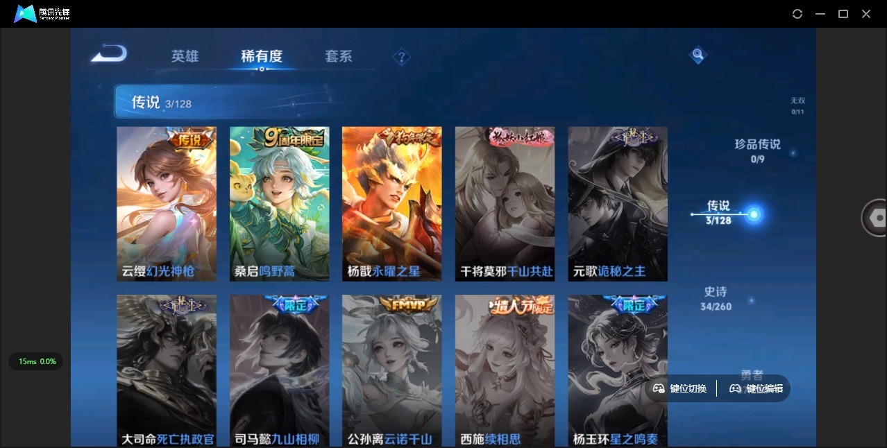 - [11471719]V6 5传说 120英雄 117皮肤 可修改实名 优质装备:黄金射手座,一念神魔 珍宝阁皮:玩趣恶龙 限定皮:愿照·岁时盈(虞姬年限),鸣野蒿,齐天大圣 史诗皮:器灵·浮梦炉,龙之律动,破空之剑,百相守梦-黄忠,黄金分割率,千年之狐,冰冠公主,末日机甲-吕布,猫狗日记-孙策,节奏热浪,摇滚巨星,水果甜心,星夜王子,鬼剑武藏,心灵战警,舞动绿茵,纤云弄巧,曙光守护者,金属风暴,圣诞恋歌,鹰眼统帅