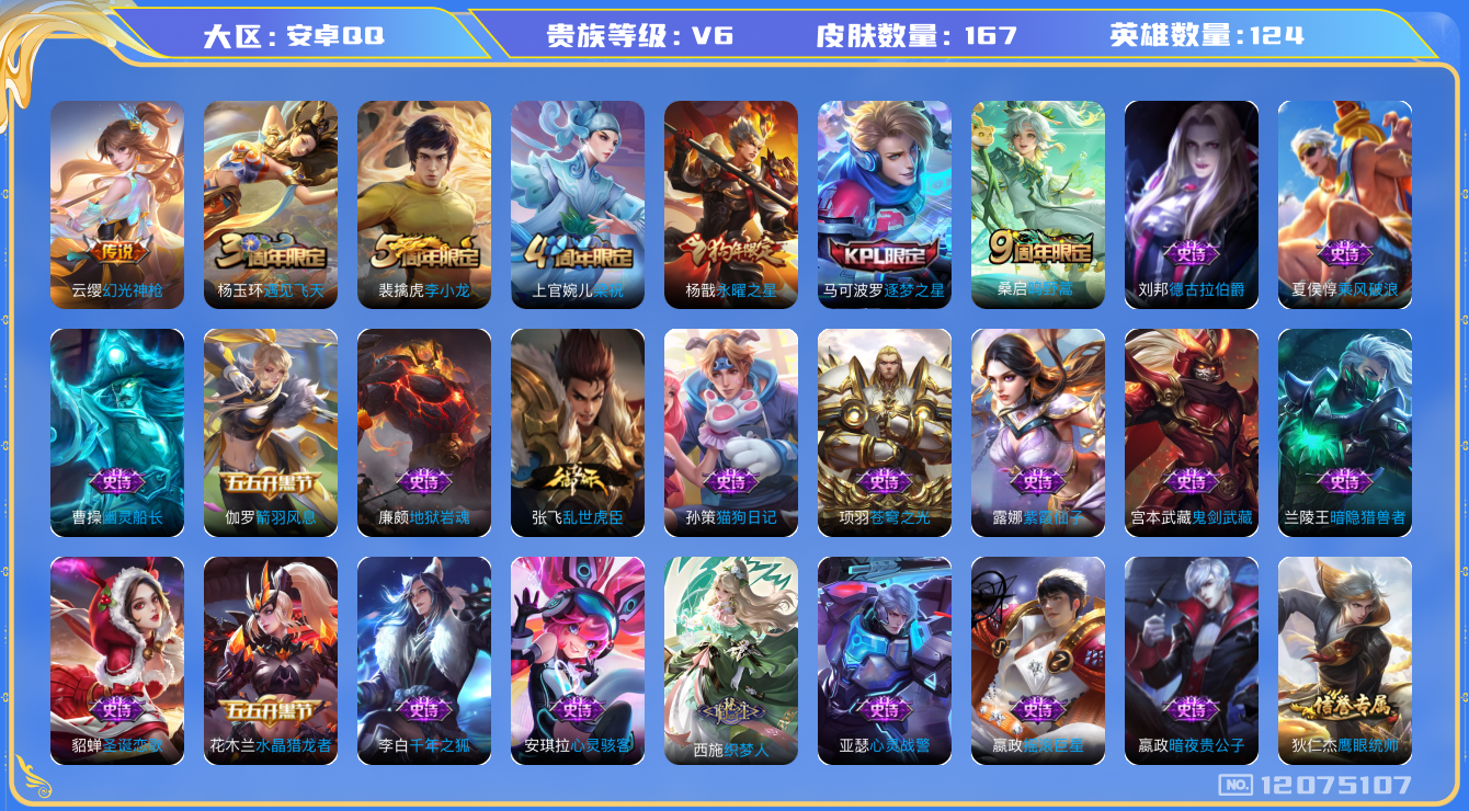 [12075107]V6 3传说 124英雄 167皮肤 可修改实名 传说皮:幻光神枪 珍宝阁皮:蔷薇恋人 限定皮:鸣野蒿,遇见飞天,梁祝,逐梦之星,李小龙,永曜之星 史诗皮:织梦人,紫霞仙子,苍穹之光,特工魅影,千年之狐,猫狗日记-孙策,乱世虎臣,女仆咖啡,摇滚巨星,心灵骇客,功夫厨神,德古拉伯爵,暗隐猎兽者,幽灵船长,鬼剑武藏,心灵战警,地狱岩魂,纤云弄巧,繁星吟游(呼啦呼啦),乘风破浪,水晶猎龙者,箭羽风息,圣诞恋歌,鹰眼统帅,暗夜贵公子,魅力维加斯,未来纪元-赵云