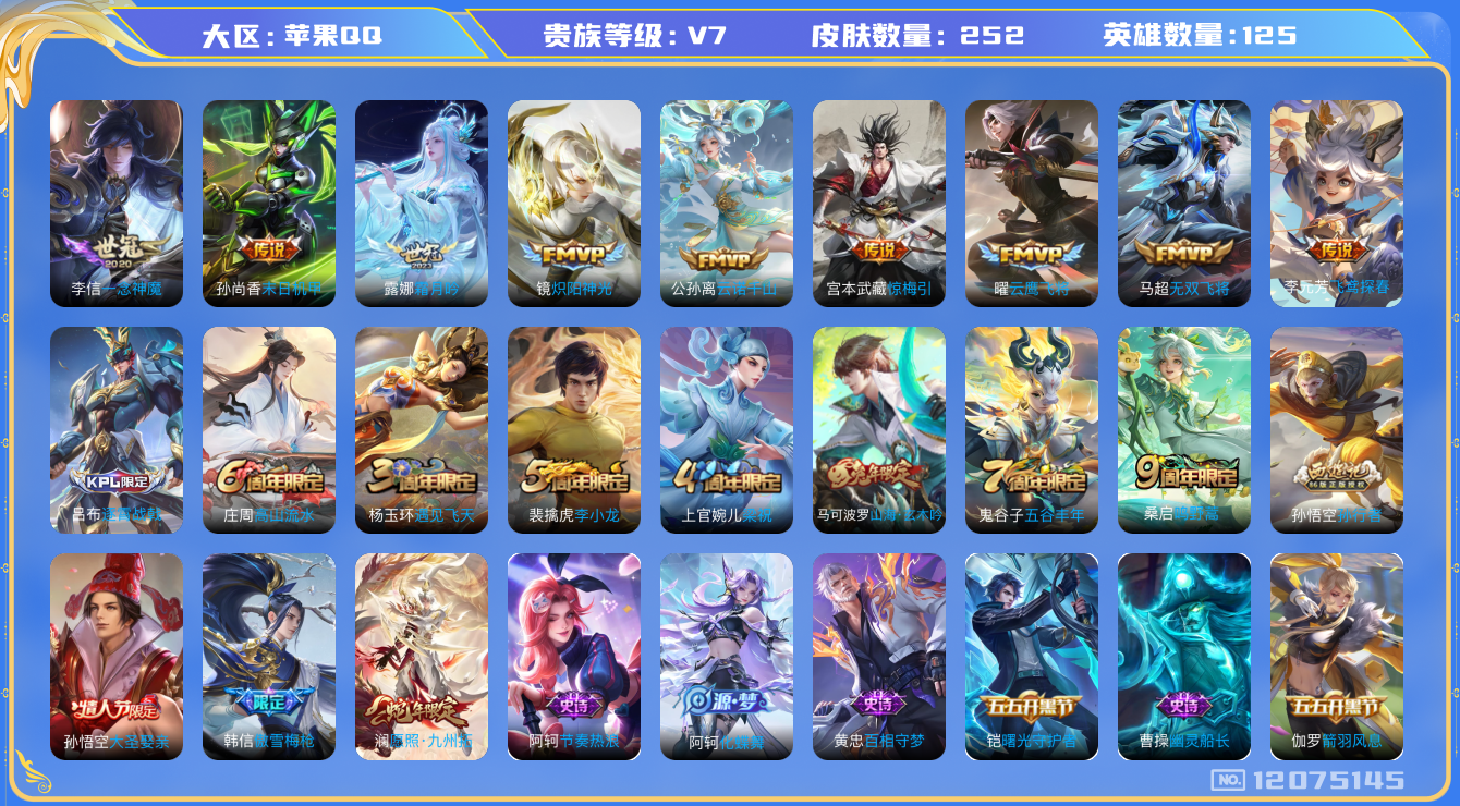 [12075145]V7 11传说 125英雄 252皮肤 可修改实名 优质装备:云鹰飞将(小将军),炽阳神光,一念神魔,末日机甲-孙尚香(绿蚂蚱),飞鸢探春,无双飞将,惊梅引,霜月吟 传说皮:云诺千山 珍宝阁皮:胡桃夹子,玩趣恶龙 限定皮:愿照·九州拓(澜年限),逐霄战戟,鸣野蒿,傲雪梅枪,遇见飞天,高山流水,五谷丰年,梁祝,李小龙,孙行者,大圣娶亲,山海·玄木吟(马可年限) 史诗皮:化蝶舞,谪仙醉月,龙之律动,雪豹·霜爪,茶境仙,破空之剑,百相守梦-黄忠,紫霞仙子,黄金分割率,特工魅影,千年之狐,江河有灵,百解令(蒙犽),蒙恬荣光圣徽,冰冠公主,偶像歌手,电玩·爆裂旋风,末日机甲-吕布,节奏热浪,修罗,摇滚巨星,水果甜心,星夜王子,功夫厨神,暗隐猎兽者,幽灵船长,鬼剑武藏,暗渊魔法,纤云弄巧,拒霜思,逐浪之夏,水晶猎龙者,曙光守护者,箭羽风息,金属风暴,圣诞狂欢,圣诞恋歌,鹰眼统帅,魅力维加斯,黎明之约,赏金猎手,顽趣-阿古朵,无心,玫瑰异探