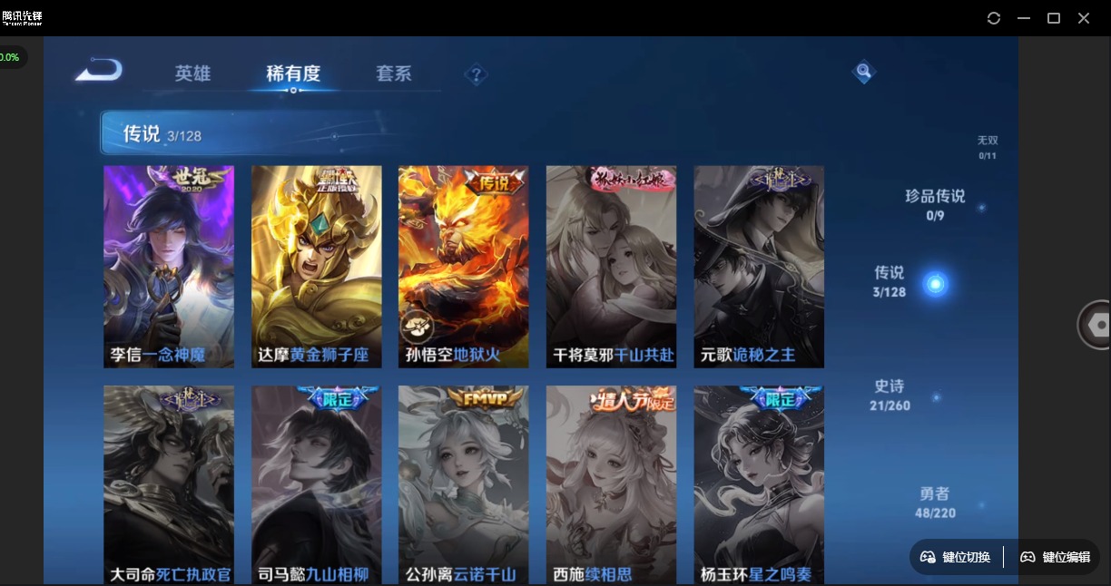 - [12090889]V7 1典藏 1珍品传说 7传说 125英雄 190皮肤 可修改实名 优质装备:全息碎影(猴子典藏),黄金狮子座,冠军飞将,久胜战神,超时空战士-狄仁杰 珍品传说:时之奇旅-孙策 传说皮:幻光神枪 珍宝阁皮:妄想食味 限定皮:愿照·山河定(司空震年限),鸣野蒿,梁祝,御风骁将(吕布年限),李小龙,山海·玄木吟(马可年限) 史诗皮:器灵·浮梦炉,化蝶舞,星界战将,谪仙醉月,龙之律动,藏狐·褐绒,茶境仙,破空之剑,紫霞仙子,特工魅影,雪夜绮愿(周瑜),魅语,百解令(蒙犽),高渐离燃音魔法,蒙恬荣光圣徽,无限星赏官,冰冠公主,偶像歌手,龙骑士(小龙虾),末日机甲-吕布,乱世虎臣,节奏热浪,修罗,水果甜心,德古拉伯爵,暗隐猎兽者,幽灵船长,鬼剑武藏,地狱岩魂,纤云弄巧,缤纷独角兽,水晶猎龙者,圣诞狂欢,鹰眼统帅,魅力维加斯