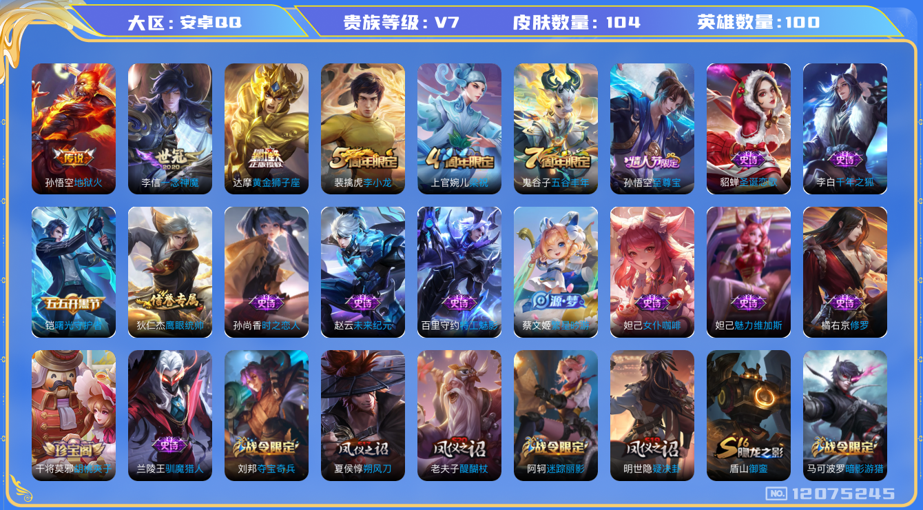 [12075245]V7 3传说 100英雄 104皮肤 可修改实名 优质装备:黄金狮子座,一念神魔,地狱火 珍宝阁皮:胡桃夹子 限定皮:至尊宝,五谷丰年,梁祝,李小龙 史诗皮:特工魅影,千年之狐,时之恋人-孙尚香,修罗,女仆咖啡,繁星吟游(呼啦呼啦),曙光守护者,圣诞恋歌,鹰眼统帅,魅力维加斯,未来纪元-赵云