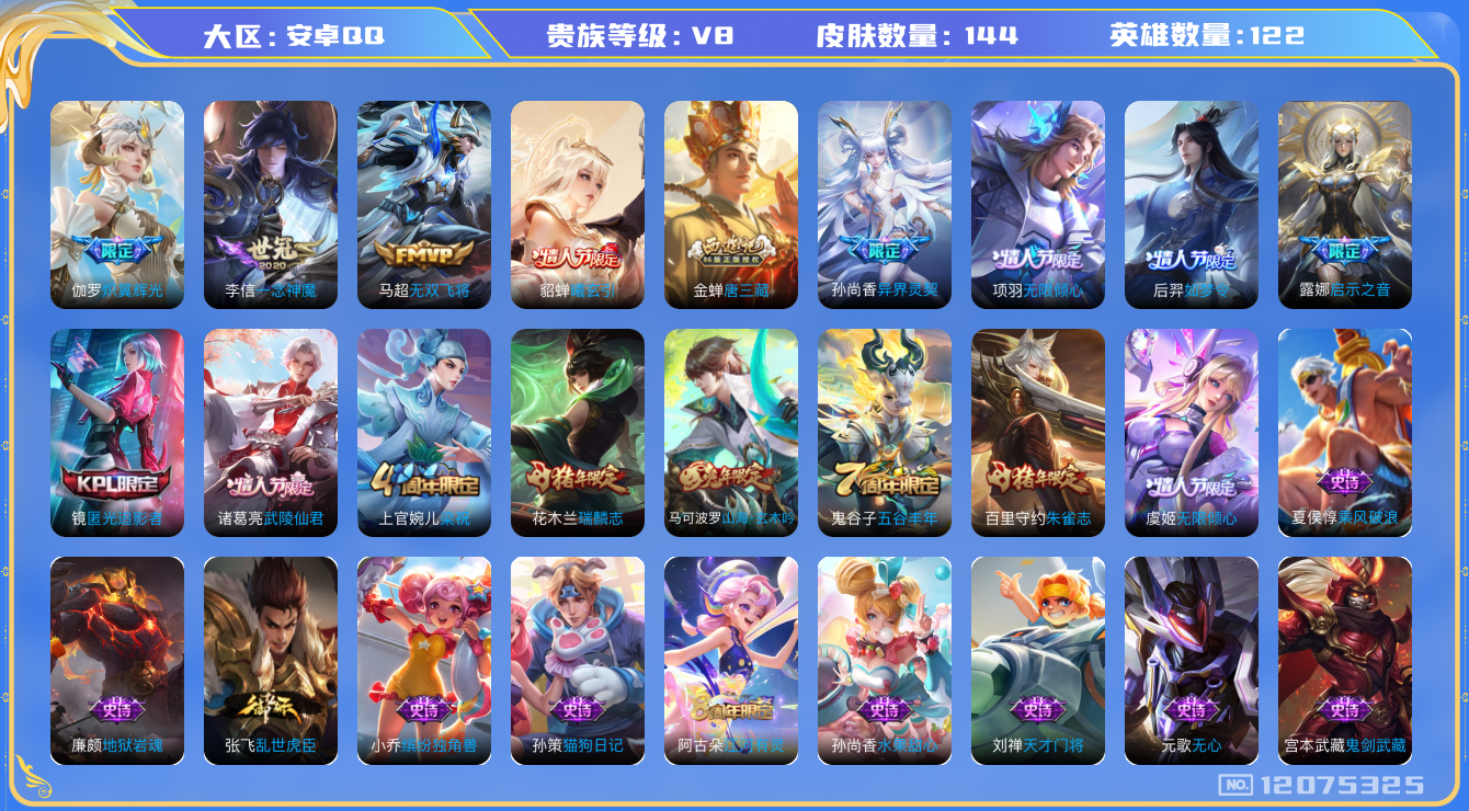 - PX_2095067-实名: 可修改 贵族等级: V7 英雄数: 124 皮肤数: 114 传说皮: 冠军飞将,黄金白羊座,猫影幻舞,超时空战士-狄仁杰,山海·苍雷引,乘龙·淬吴钩 限定皮: 御风骁将,龙胆,烈魂,孙行者,五谷丰年,神器·万象笔,山海·玄木吟