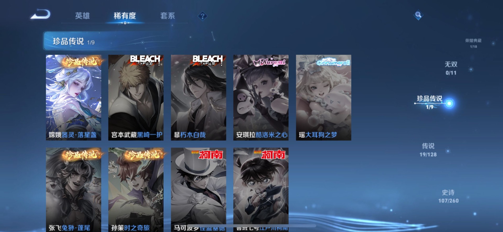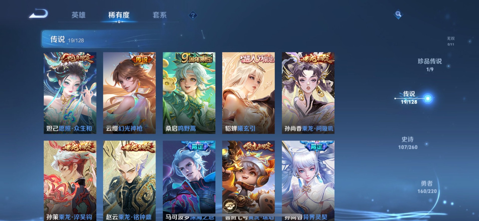 - [12116099]V8 1珍品传说 18传说 123英雄 242皮肤 可修改实名 优质装备:黑崎一护,黄金狮子座,云鹰飞将(小将军),猫影幻舞,炽阳神光,一念神魔,末日机甲-孙尚香(绿蚂蚱),李逍遥,时之恋人-刘备(电焊工),超时空战士-狄仁杰,无双飞将,浮生妄 传说皮:貂蝉曦玄引 珍宝阁皮:蔷薇恋人,女武神 限定皮:鸣野蒿,至尊宝,傲雪梅枪,补天,魔法小厨娘,时雨天司(水龙头),遇见飞天,诗剑行,五谷丰年,武圣,梁祝,御风骁将(吕布年限),天狼狩猎者,李小龙,如梦令-嫦娥,如梦令-后羿,圣诞老人,默契交锋-花木兰,大圣娶亲,冰霜恋舞曲,云端筑梦师,山海·玄木吟(马可年限) 史诗皮:鸭鸭历险记-刘禅,龙之律动,石田雨龙,紫霞仙子,黄金分割率,特工魅影,魅语,蒙恬荣光圣徽,冰冠公主,偶像歌手,猫狗日记-孙策,乱世虎臣,节奏热浪,女仆咖啡,水果甜心,天才门将,星夜王子,功夫厨神,鬼剑武藏,舞动绿茵,纤云弄巧,繁星吟游(呼啦呼啦),缤纷独角兽,乘风破浪,逐浪之夏,水晶猎龙者,曙光守护者,箭羽风息,金属风暴,原初追逐者,圣诞狂欢,圣诞恋歌,鹰眼统帅,黎明之约