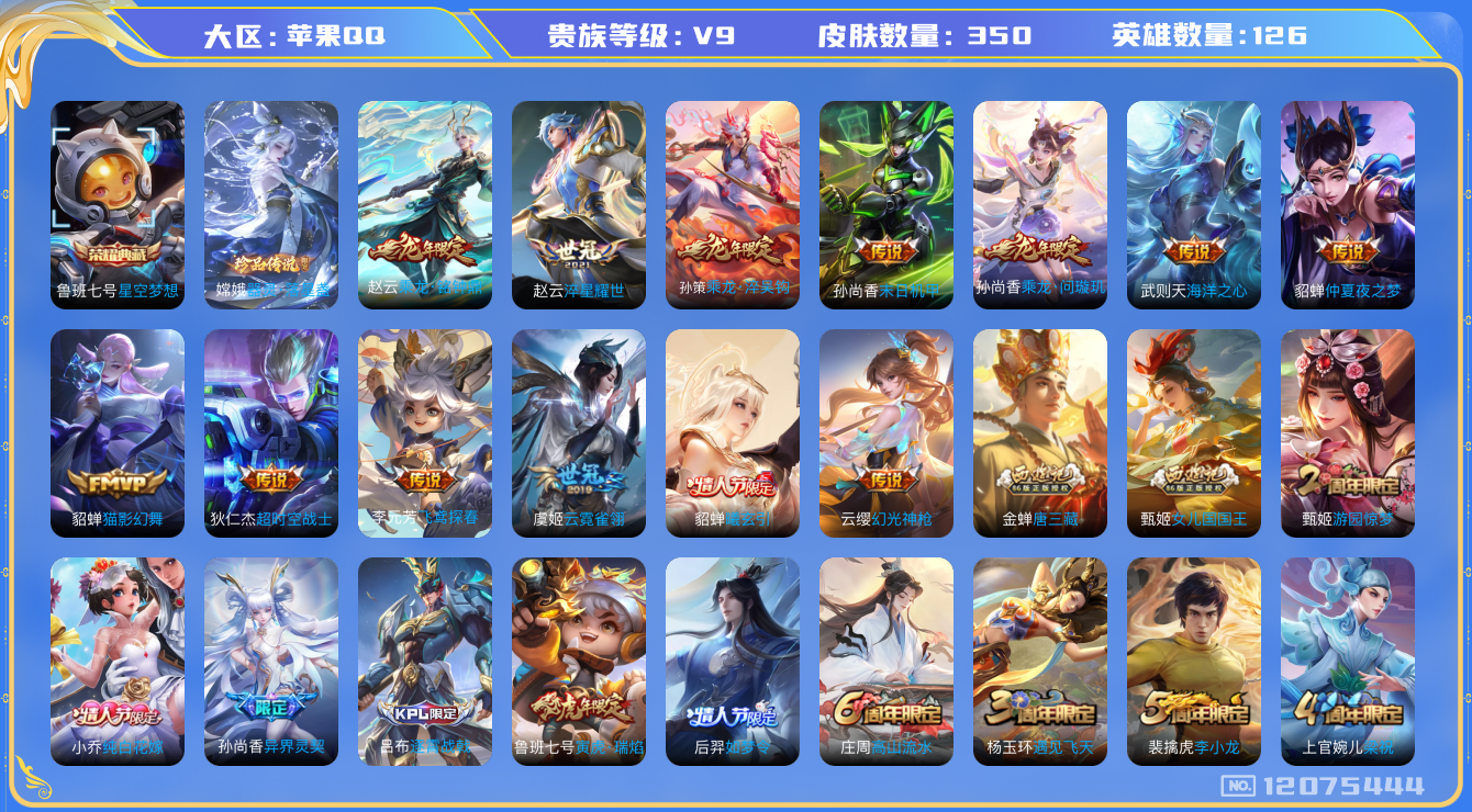 [12075444]V9 1典藏 1珍品传说 19传说 126英雄 350皮肤 典藏英雄武则天 女号 可修改实名 优质装备:星空梦想(太空人),器灵·落星盏,猫影幻舞,云霓雀翎,末日机甲-孙尚香(绿蚂蚱),仲夏夜之梦(大飞蛾),海洋之心,飞鸢探春,淬星耀世,超时空战士-狄仁杰,涂山容容 传说皮:乘龙·问璇玑(孙尚香年限),乘龙·铭钟鼎(赵云年限),乘龙·淬吴钩(孙策年限),貂蝉曦玄引,幻光神枪 珍宝阁皮:万物之道,优雅恋人,蔷薇恋人 限定皮:愿照·众生和(妲己年限),逐霄战戟,鸣野蒿,凤凰于飞,异界灵契(白毛香),时之彼端,魔法小厨娘,遇见飞天,高山流水,五谷丰年,游园惊梦,梁祝,逐梦之星,李小龙,如梦令-后羿,纯白花嫁,女儿国国王,寅虎·瑞焰(虎皮蛋子),深海之息(深海大菠萝),唐三藏 史诗皮:鸭鸭历险记-刘禅,器灵·浮梦炉,星界战将,龙之律动,百相守梦-周瑜,破空之剑,琥珀纪元伽罗,蔬乡物语(鲁班七号),乘龙·聚宝船(安琪拉年限),乘龙·忆丹青(大乔年限),百相守梦-百里守约,百相守梦-黄忠,遇见神鹿,紫霞仙子,电玩小子(小书包),黄金分割率,特工魅影,江河有灵,真我赫兹(百里守约),浮梦罗烟,魅语,百解令(蒙犽),高渐离燃音魔法,蒙恬荣光圣徽,无限星赏官,冰冠公主,偶像歌手,晚萤,暗夜猫娘,银翎春语,末日机甲-吕布,猫狗日记-孙策,猫狗日记-大乔,乱世虎臣,节奏热浪,女仆咖啡,摇滚巨星,水果甜心,绅士熊喵,天才门将,星夜王子,心灵骇客,时之奇旅-安琪拉,功夫厨神,德古拉伯爵,暗隐猎兽者,幽灵船长,鬼剑武藏,心灵战警,乐园奇幻夜,舞动绿茵,地狱岩魂,诗语江南,纤云弄巧,繁星吟游(呼啦呼啦),拒霜思,缤纷独角兽,乘风破浪,逐浪之夏,水晶猎龙者,曙光守护者,箭羽风息,唤灵魅影,金属风暴,原初追逐者,圣诞狂欢,圣诞恋歌,鹰眼统帅,暗夜贵公子,魅力维加斯,黎明之约,无心,未来纪元-赵云