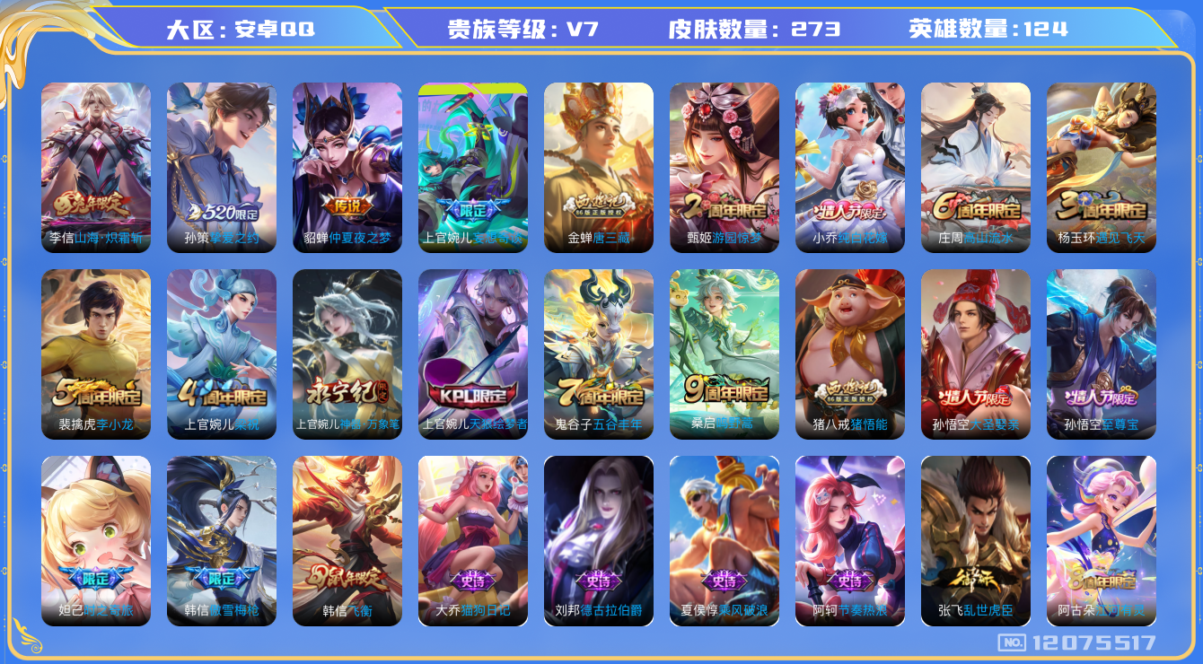 [12075517]V7 5传说 124英雄 273皮肤 可修改实名 优质装备:仲夏夜之梦(大飞蛾),挚爱之约,山海·炽霜斩(李信年限),妄想奇谈 珍宝阁皮:优雅恋人,蔷薇恋人,女武神 限定皮:鸣野蒿,至尊宝,傲雪梅枪,飞衡(韩信年限),遇见飞天,高山流水,五谷丰年,游园惊梦,梁祝,天狼绘梦者,李小龙,纯白花嫁,猪悟能,大圣娶亲,唐三藏,时之奇旅-妲己,神器·万象笔 史诗皮:星界战将,蒙犽顽岩魄,上官婉儿群星魔术团,紫霞仙子,白龙吟,黄金分割率,特工魅影,千年之狐,江河有灵,魅语,蒙恬荣光圣徽,冰冠公主,电玩·爆裂旋风,猫狗日记-大乔,乱世虎臣,节奏热浪,女仆咖啡,摇滚巨星,水果甜心,绅士熊喵,天才门将,星夜王子,心灵骇客,德古拉伯爵,暗隐猎兽者,鬼剑武藏,心灵战警,舞动绿茵,纤云弄巧,拒霜思,乘风破浪,水晶猎龙者,金属风暴,原初追逐者,圣诞狂欢,鹰眼统帅,暗夜贵公子,魅力维加斯,黎明之约,滕王阁序,无心,未来纪元-赵云