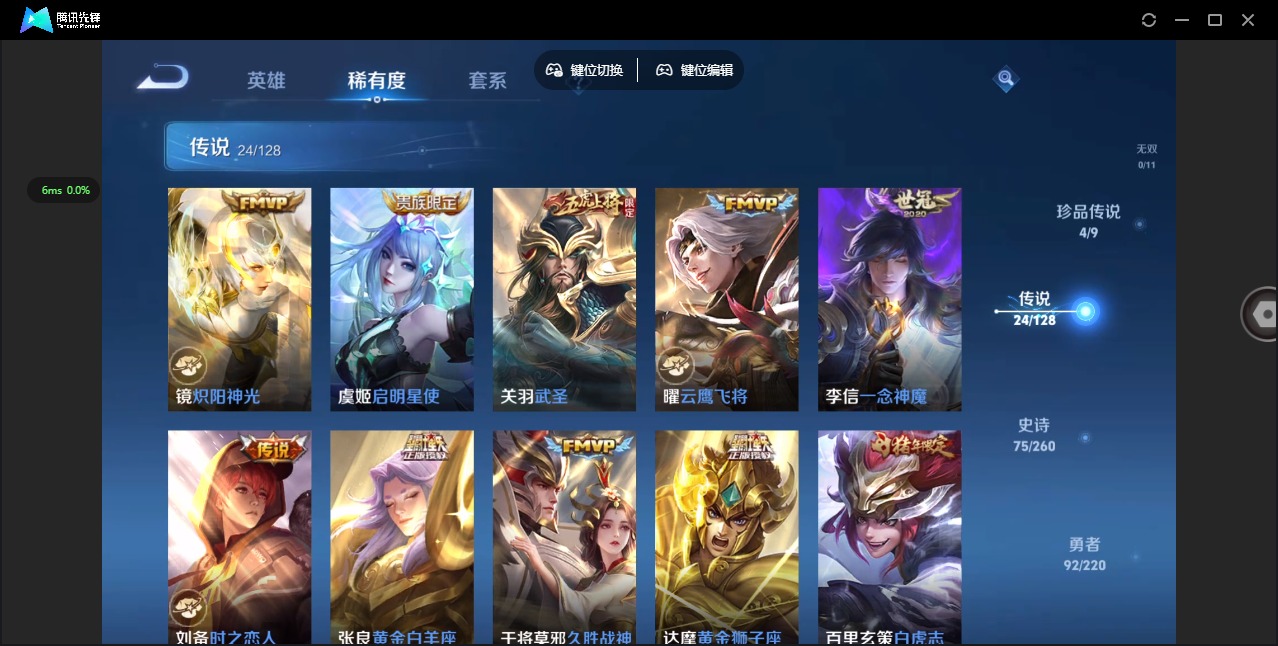 - [11471746]V6 3传说 122英雄 95皮肤 可修改实名 优质装备:黄金射手座,久胜战神,地狱之眼 珍宝阁皮:蔷薇恋人 限定皮:李小龙,逐梦之影 史诗皮:白龙吟,千年之狐,乱世虎臣,节奏热浪,修罗,心灵骇客,水晶猎龙者,曙光守护者,金属风暴,圣诞狂欢,魅力维加斯